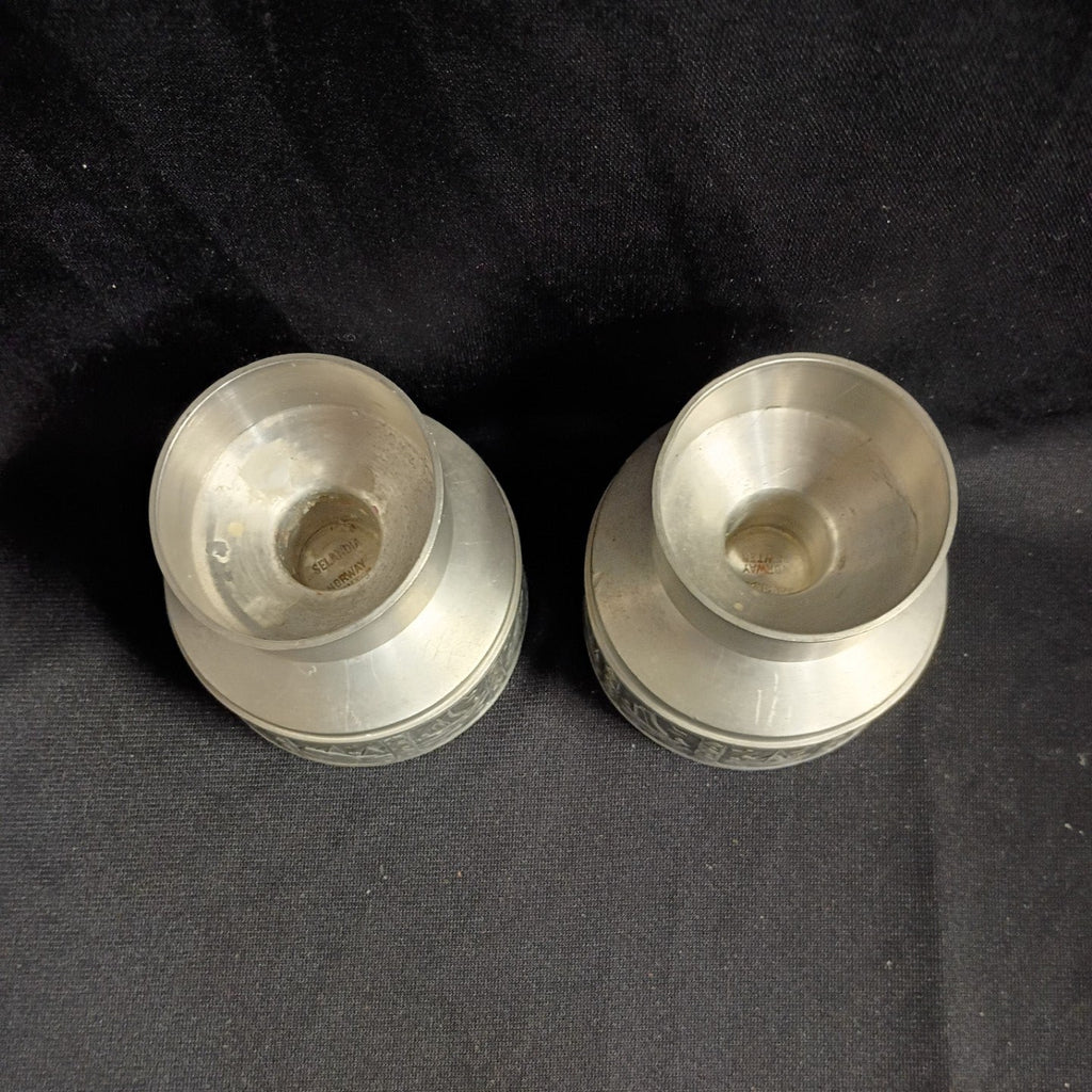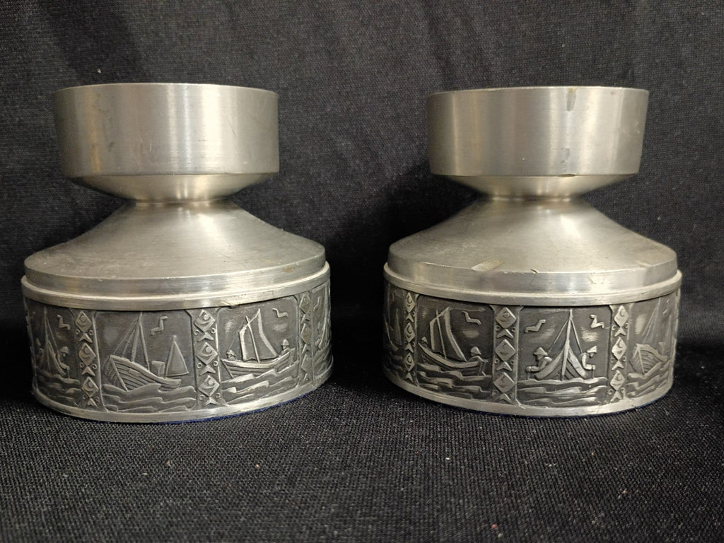 Vintage Selandia Pewter candle holders engraved with Norse boating scenes and fish design. Small chip on bottom rim of one of the holders (see photos), otherwise both in great condition. Each measures 3"H x 3"w. Both have blue felted bottoms.