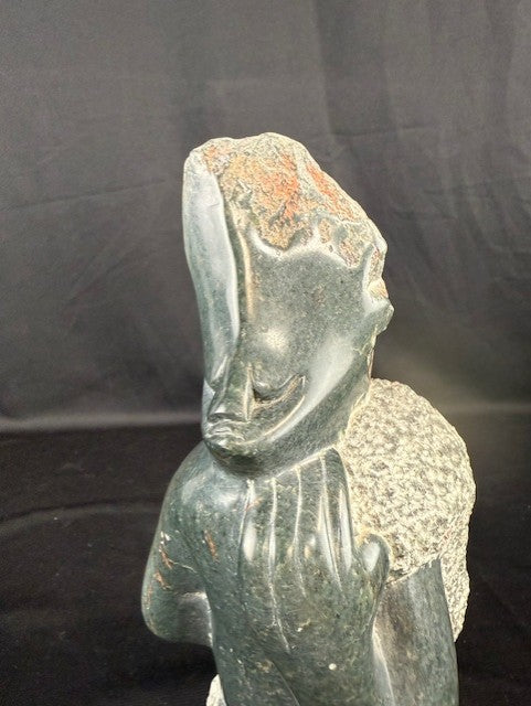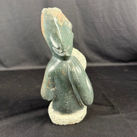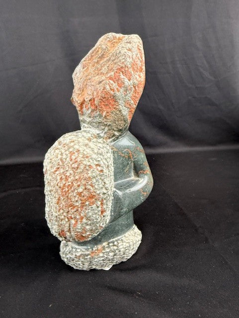 Serpentine stone carving of a woman carrying a load on her back. Standing on a base that matches the load. From Zimbabwe - likely crafted by the Shona tribe. Beautiful condition.