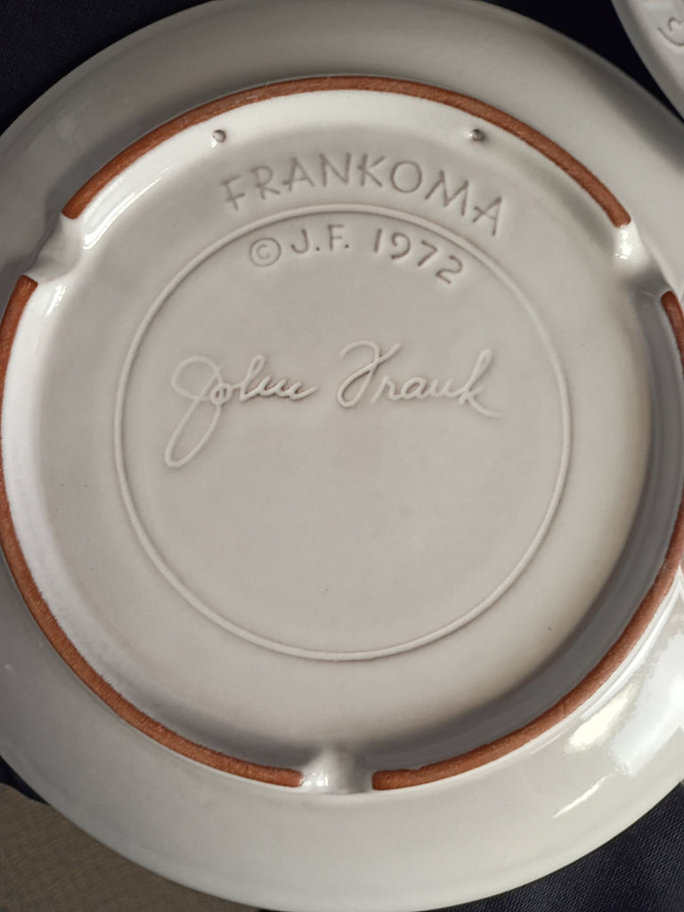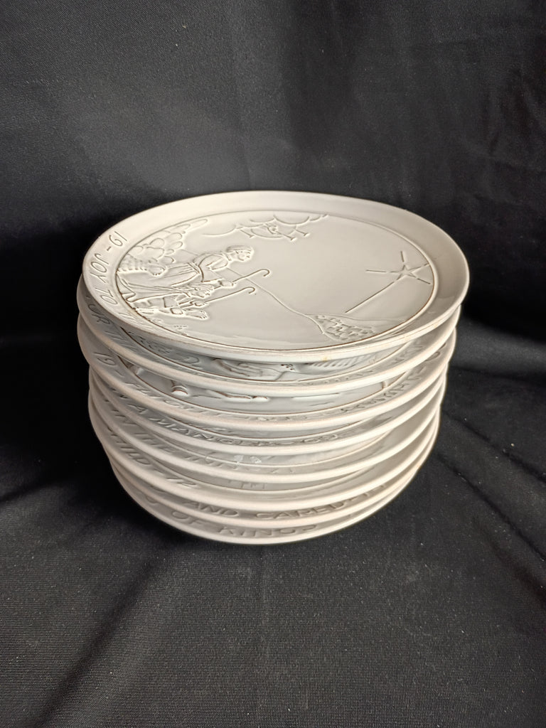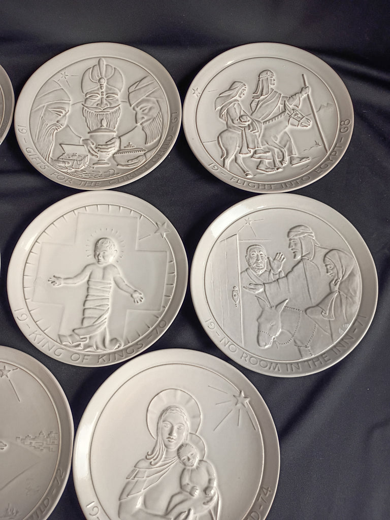 Nine Christmas decorator plates designed by John Frank for Frankoma Pottery plates.  Biblical in motif. Years included: 1966, 67, 68, 69, 70, 71, 72, & 74. Each measures 9"W and is in excellent condition.