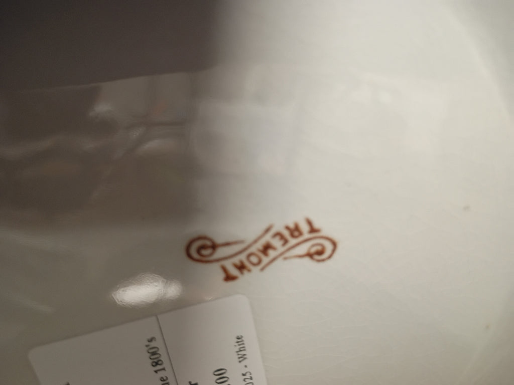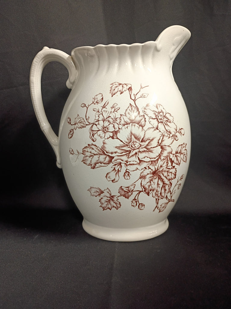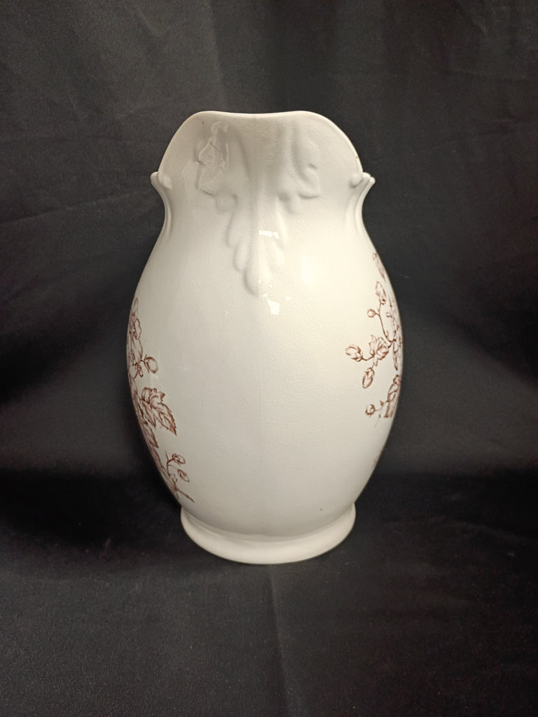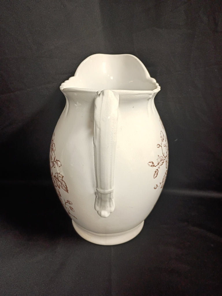 Vintage ceramic white pitcher with brown floral pattern on the front and back. Large; measures 9.75"L x 5.75"W x 11"H. Hallmarked Tremont on the bottom.