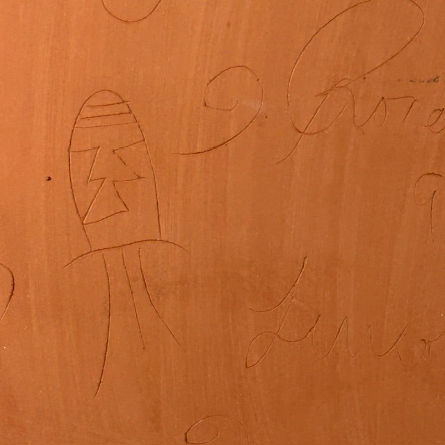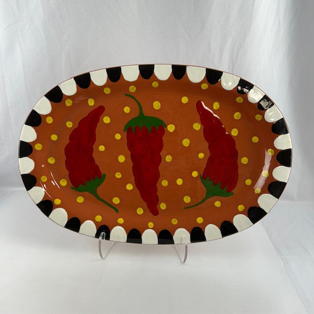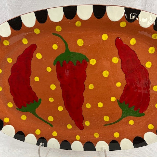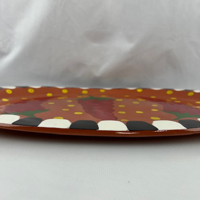 Handmade chili platter crafted from terracotta. Hand painted and glazed. Glossy finish for easy cleaning. Features a chili design accented by yellow polka dots in the middle and a black and white scalloped pattern border. In excellent condition. Signed by the artist on the back. Measures 20"L x 13"W.
