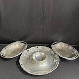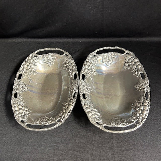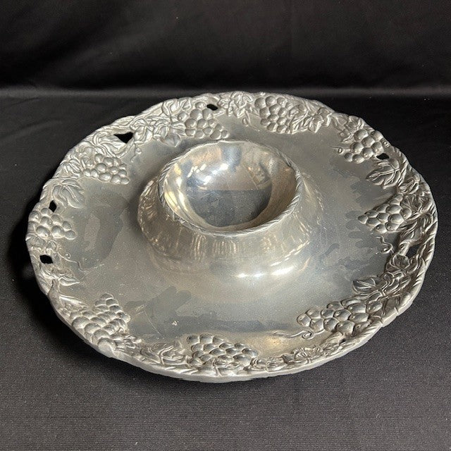 Bella Vineyard Aluminum Grapevine Design Large Chip and Dip Platter measuring 14" dia and two oval bowls measuring 11.5"L x 8.5"W x 2"H. Show some signs of wear but in overall great condition.