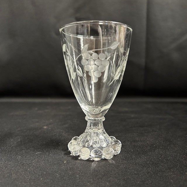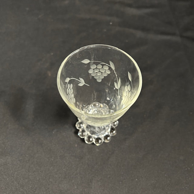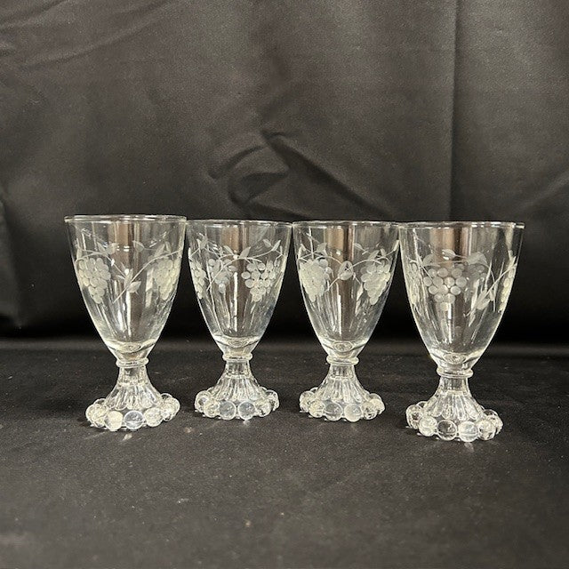 Vintage Berwick glass cordials. Set of 4, each measures 4.5"H by 2"W, could also be used for juice! All in great condition. Grape etching on the body and boopie base.