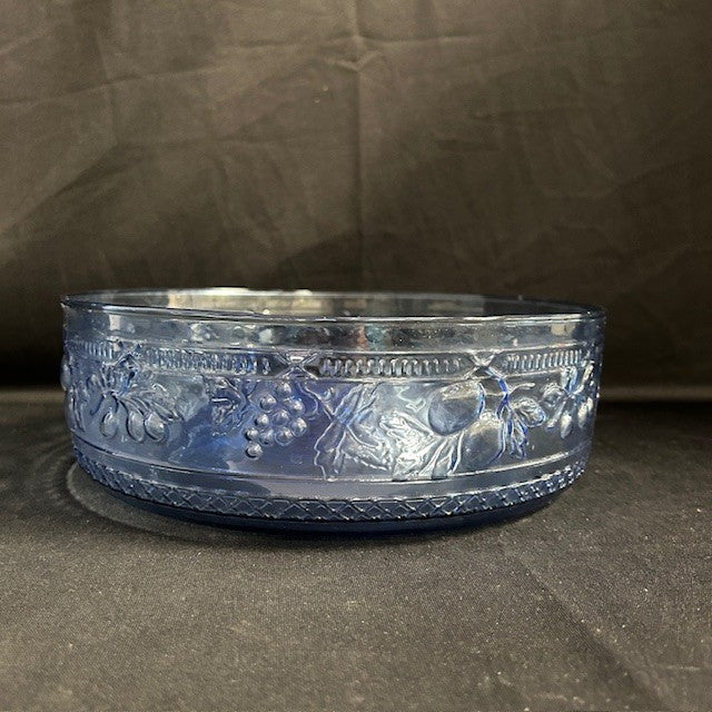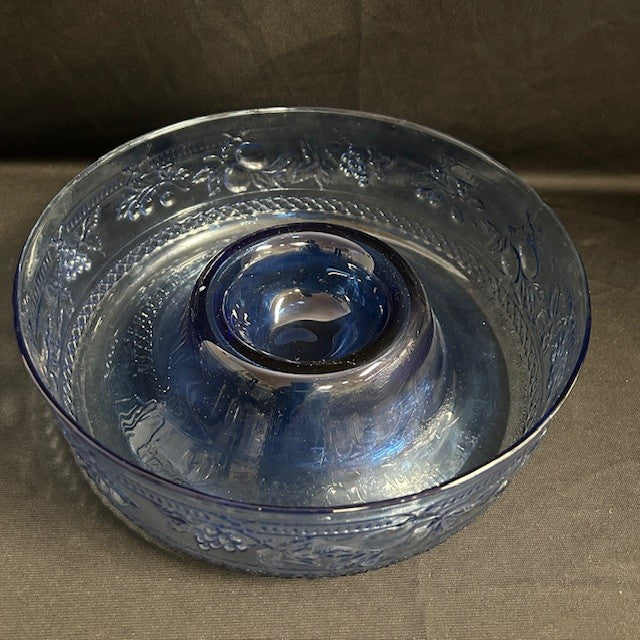 Large bowl with center area for dip. Features fruit motif on outside of bowl. Excellent condition. 10.75"W x 3.5"H