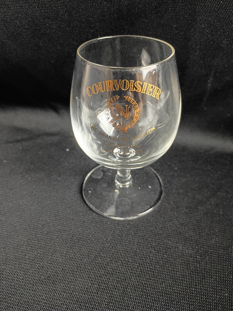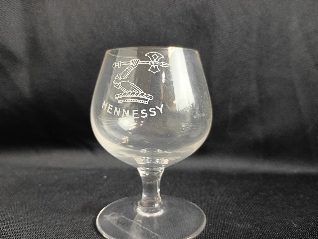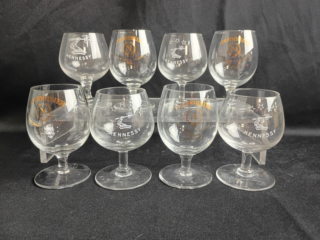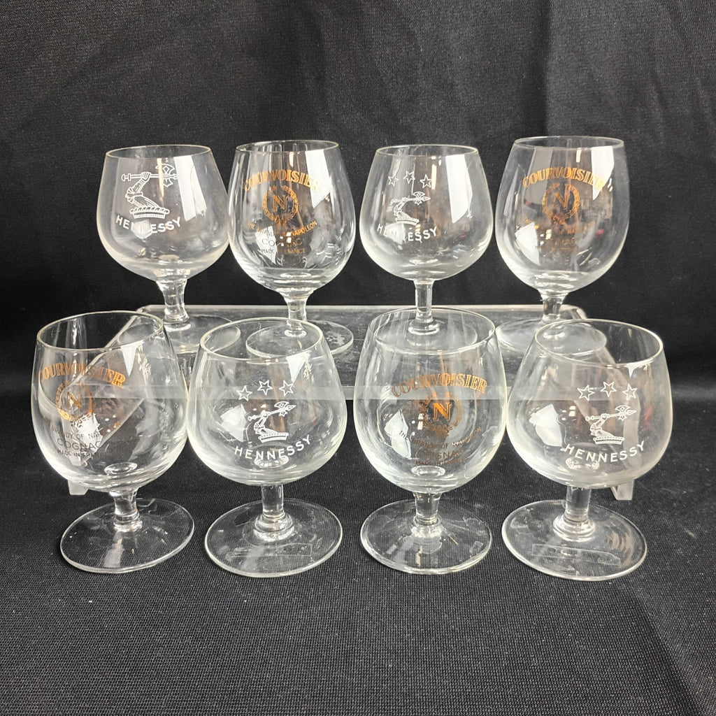 Collection of Hennessey and Courvoisier footed glass cognac snifters. Four of each In very good condition. Each measures 3.25"H x 2"w.