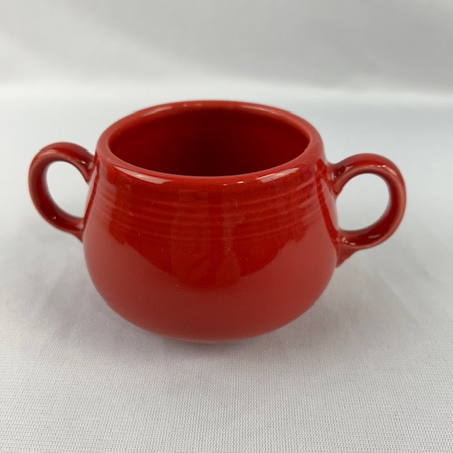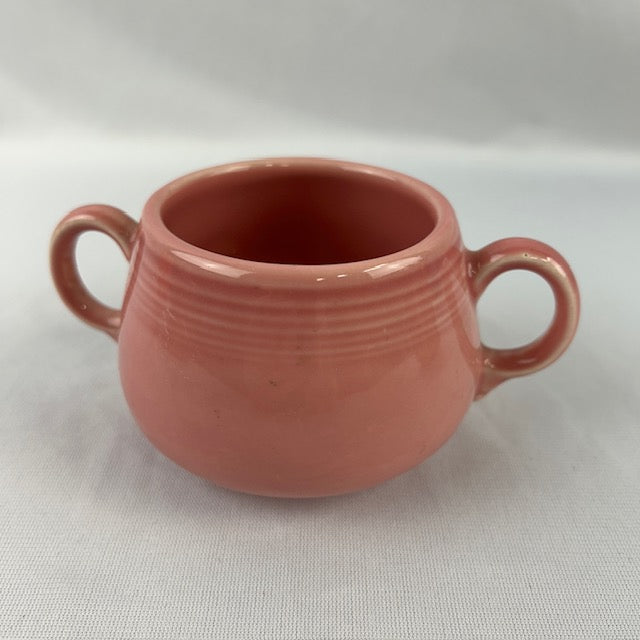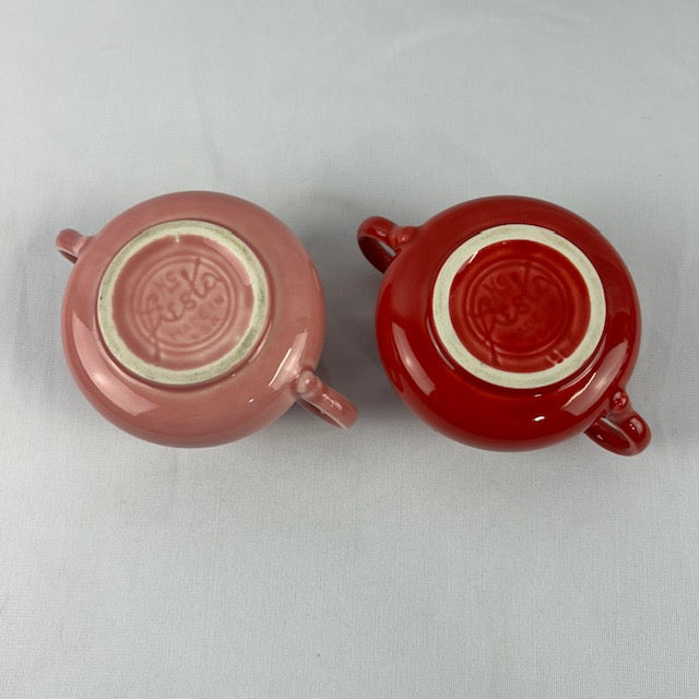 Two Fiesta ware sugar bowls. One rose pink and the other deep red. Both in excellent condition. Each measures 2.75"H x 5"W (including handles).