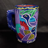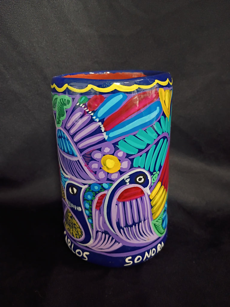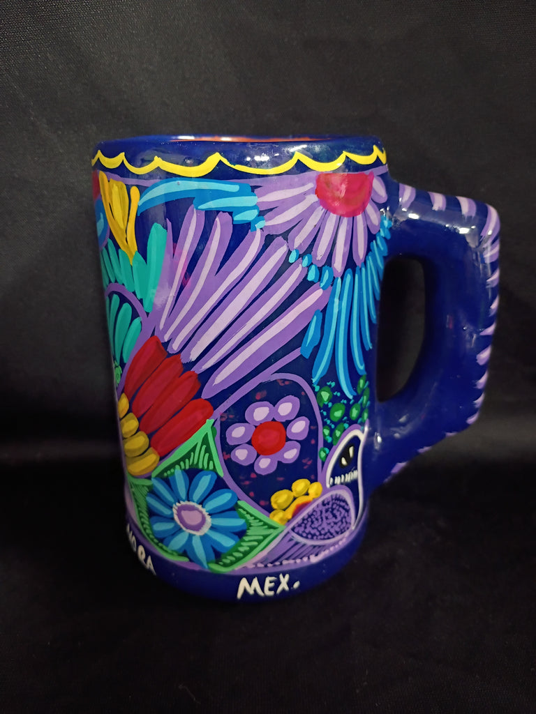 Gorgeous purple mug hand crafted in San Carlos, Mexico. Lovely vibrant colored illustrations of birds and flowers throughout. In excellent condition. Measures 4.75"L x 3.25"W x 5.25"H.