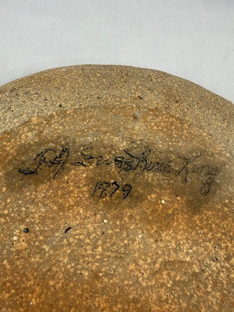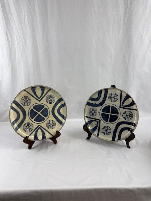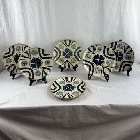 Set of 6 art pottery plates. Each measures 10 in diameter. Small crack on the back of one (see photos). In otherwise good condition. Unique geometric designs. Signed and dated 1979.