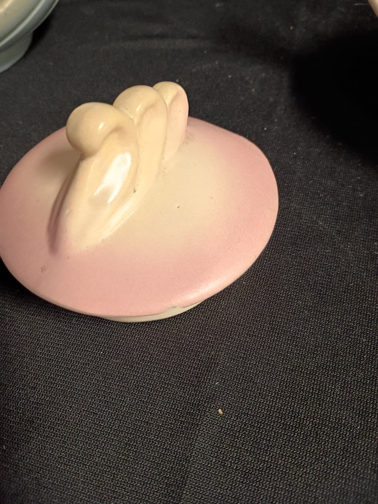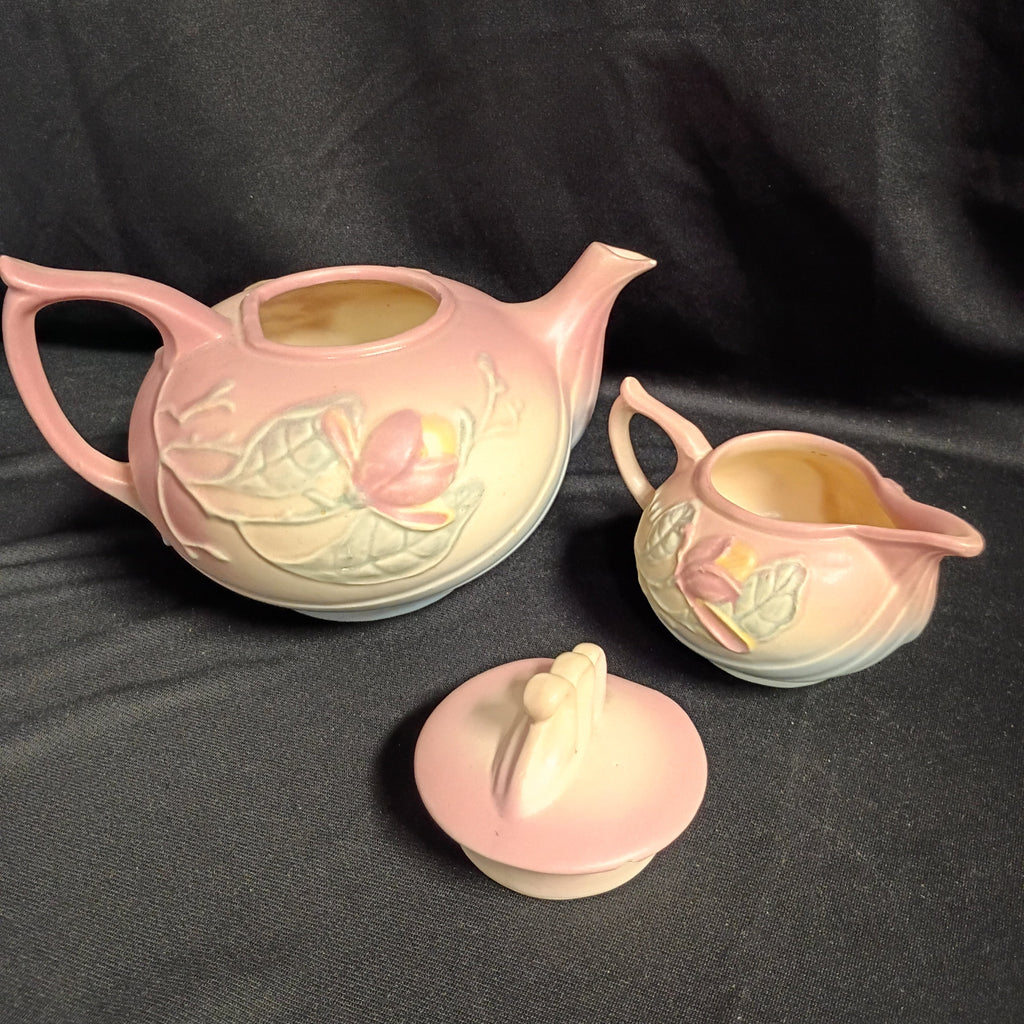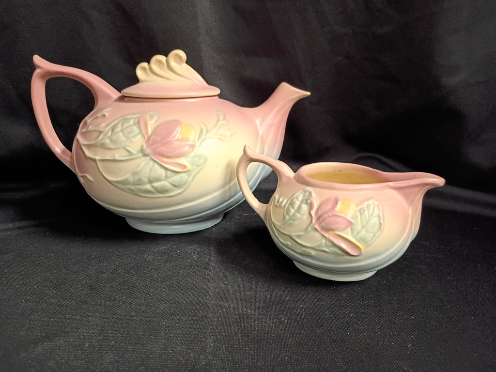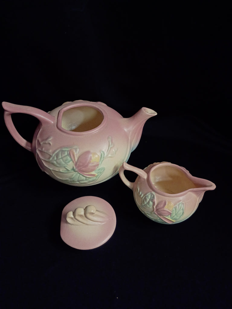 This Magnolia Pink Gloss Hull Art Pottery Teapot and Creamer show normal wear for ceramic pieces. Small chip on teapot lid Measure Teapot: 9"W x 5.5"H. Creamer: 3"H x 6"W.