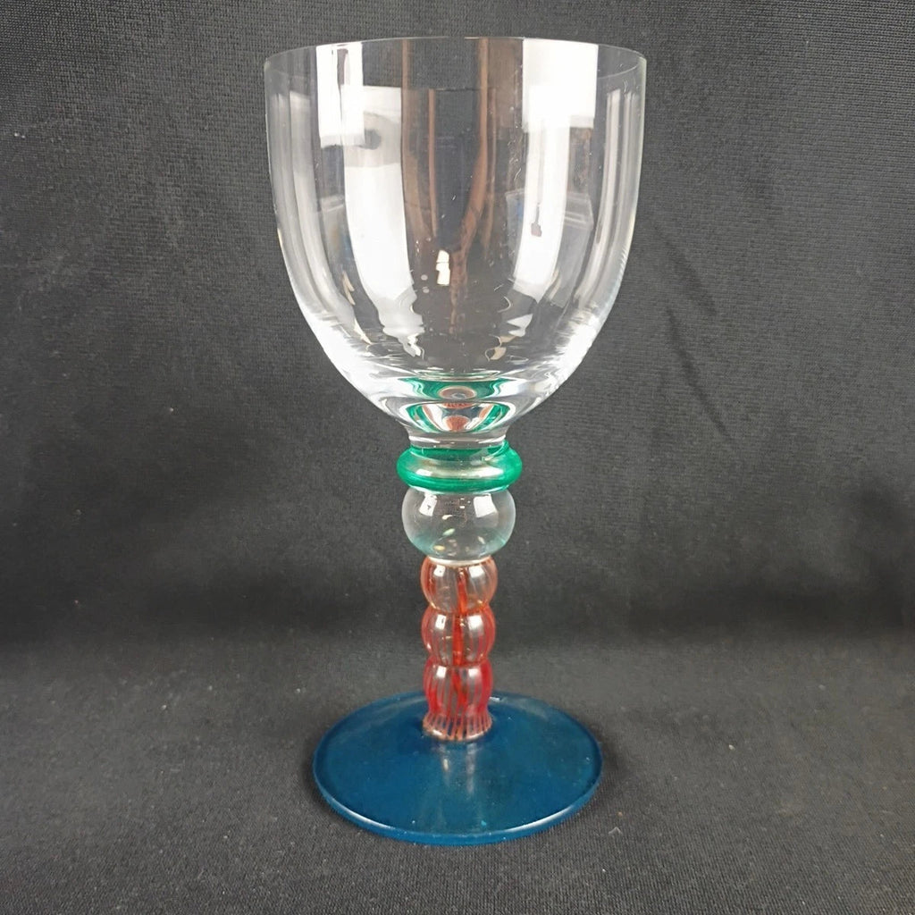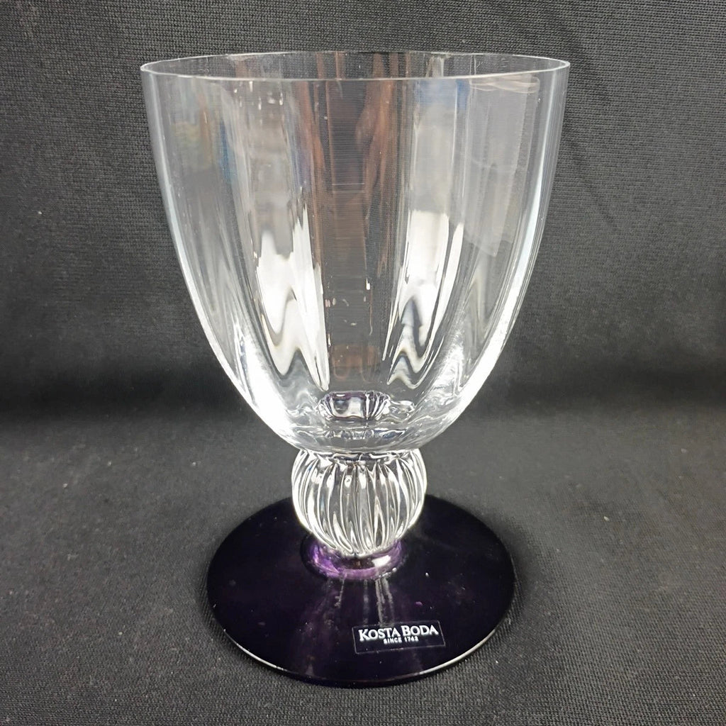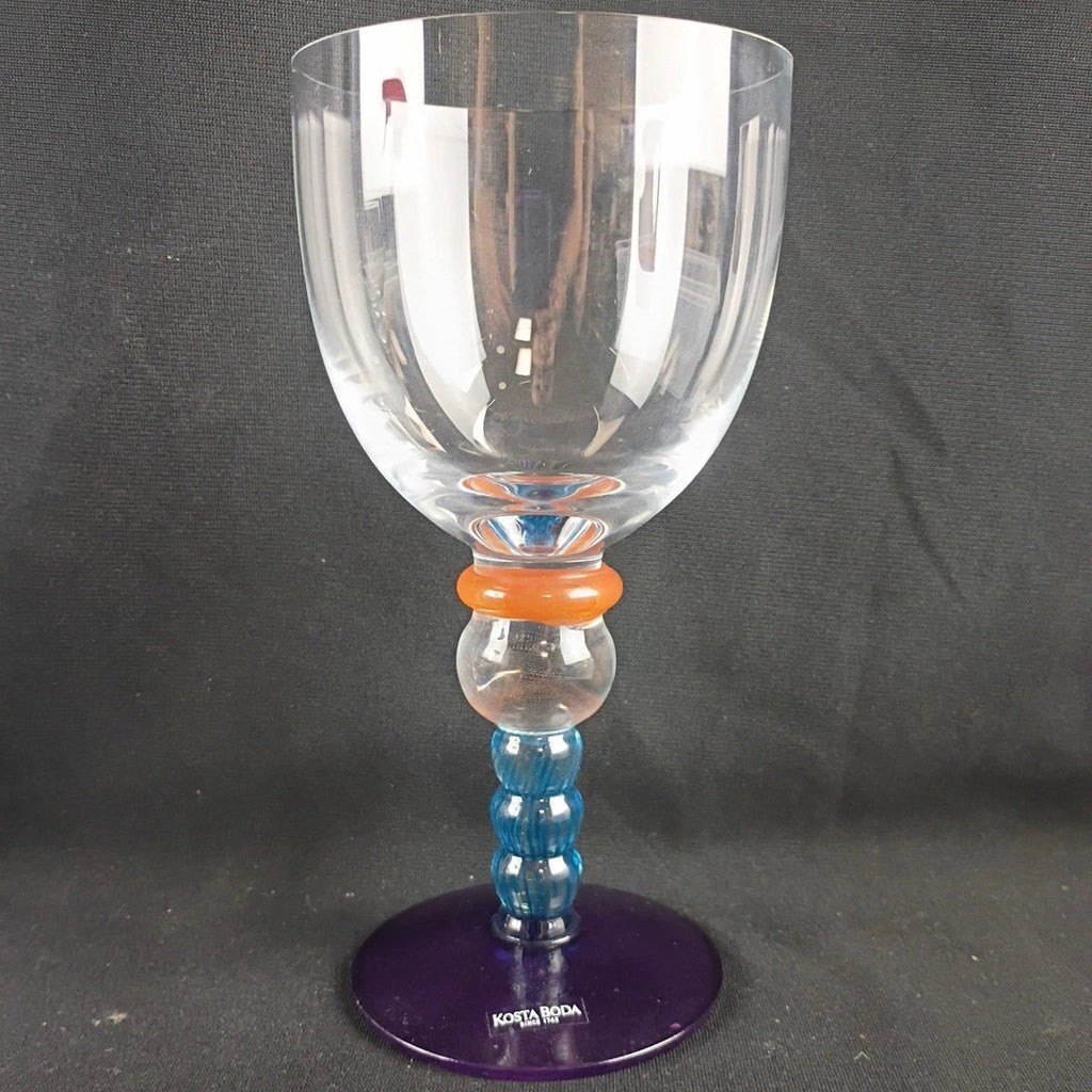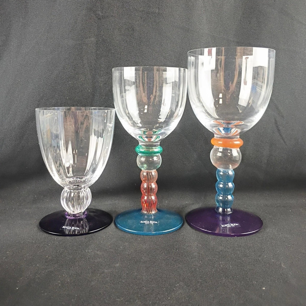 Set of three Kosta Boda art glass wine or water goblets. All in pristine condition. Each has the Hallmark sticker at the bottom. Two are from the Fenix collection by Kjell Engman, the one smaller one is from the Isadora line by Kosta Boda. From tallest to shortest the measurements are approximately as follows: 8"H x 4"W, 7"H x 3.5"W, 5.25"H x 3.5"W.