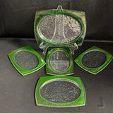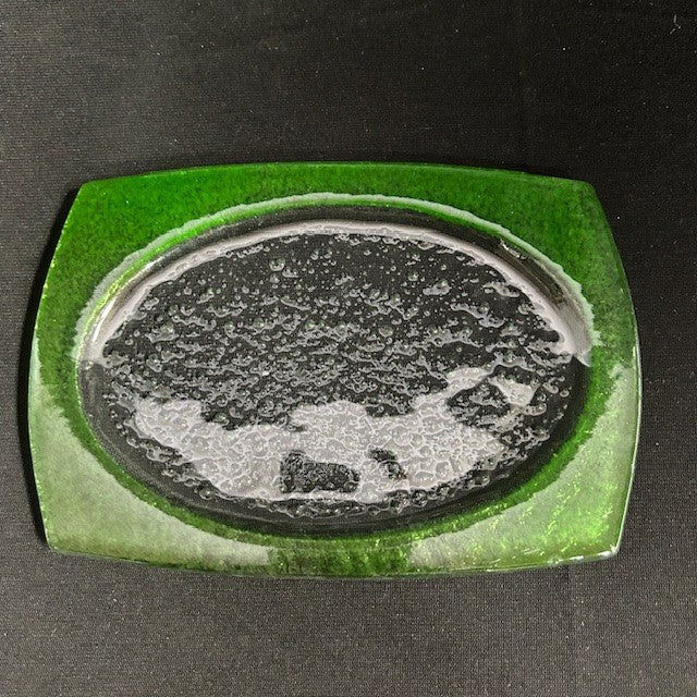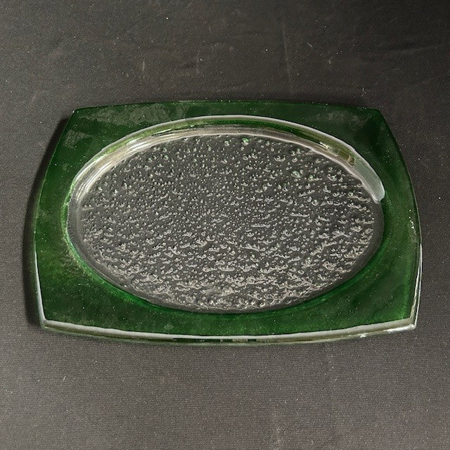 Art glass serving set constructed using Lampwork technique. Green square border with ovular clear center, bubbling texture throughout. Platter and 4 plates. Perfect for Sushi. Platter measures 10"L x 7"W, and plates are 8"L x 5.5"W each. All in excellent condition.
