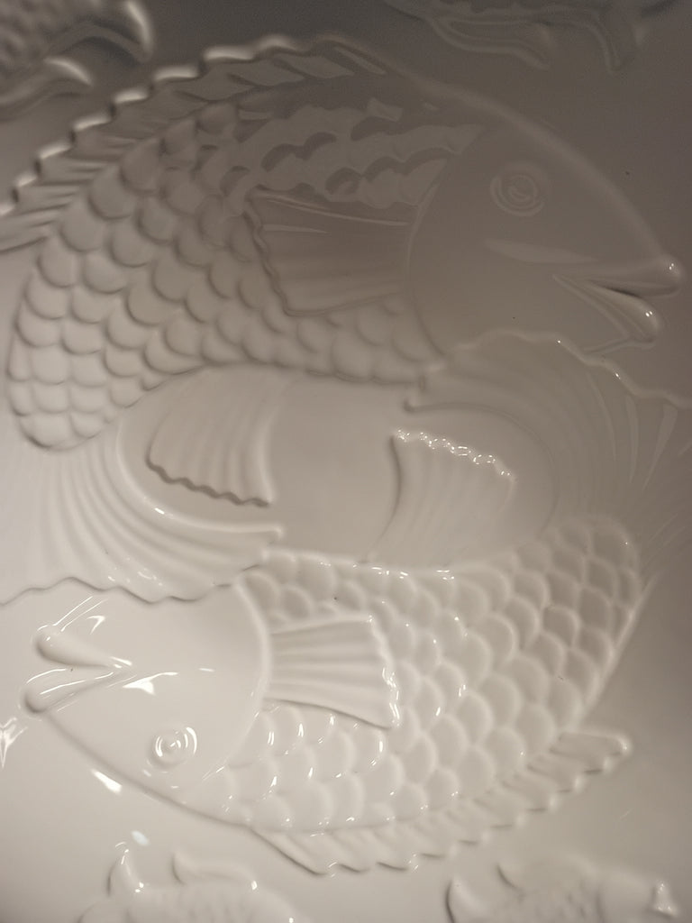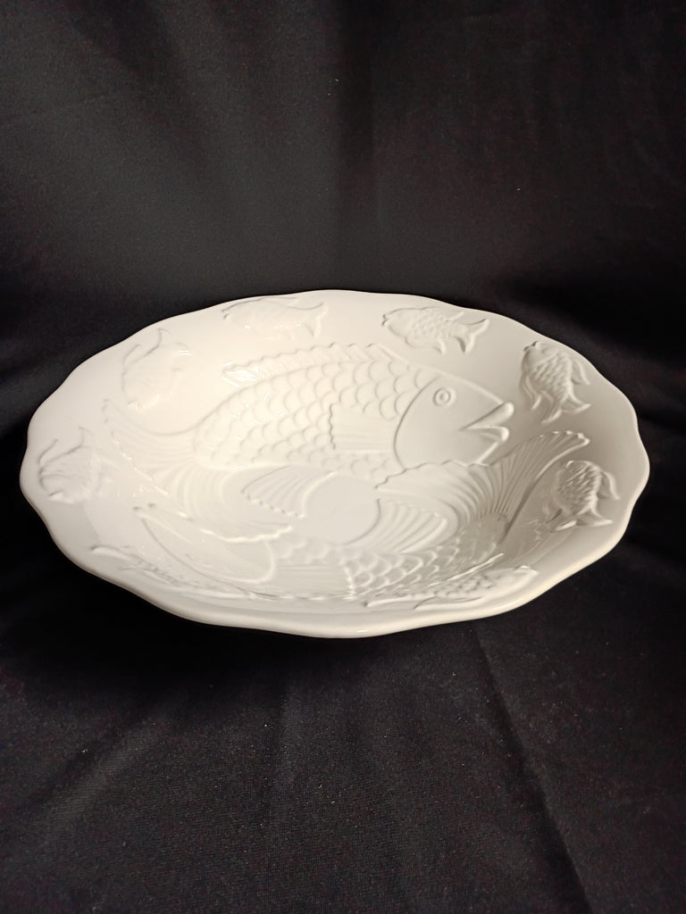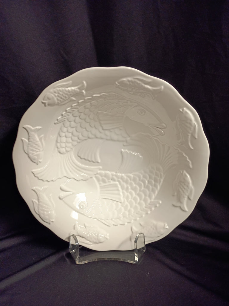 Gorgeous glossy ceramic serving bowl with fish motif. Made in Portugal. In excellent condition. Measures 3.25"H x 13.75"W.