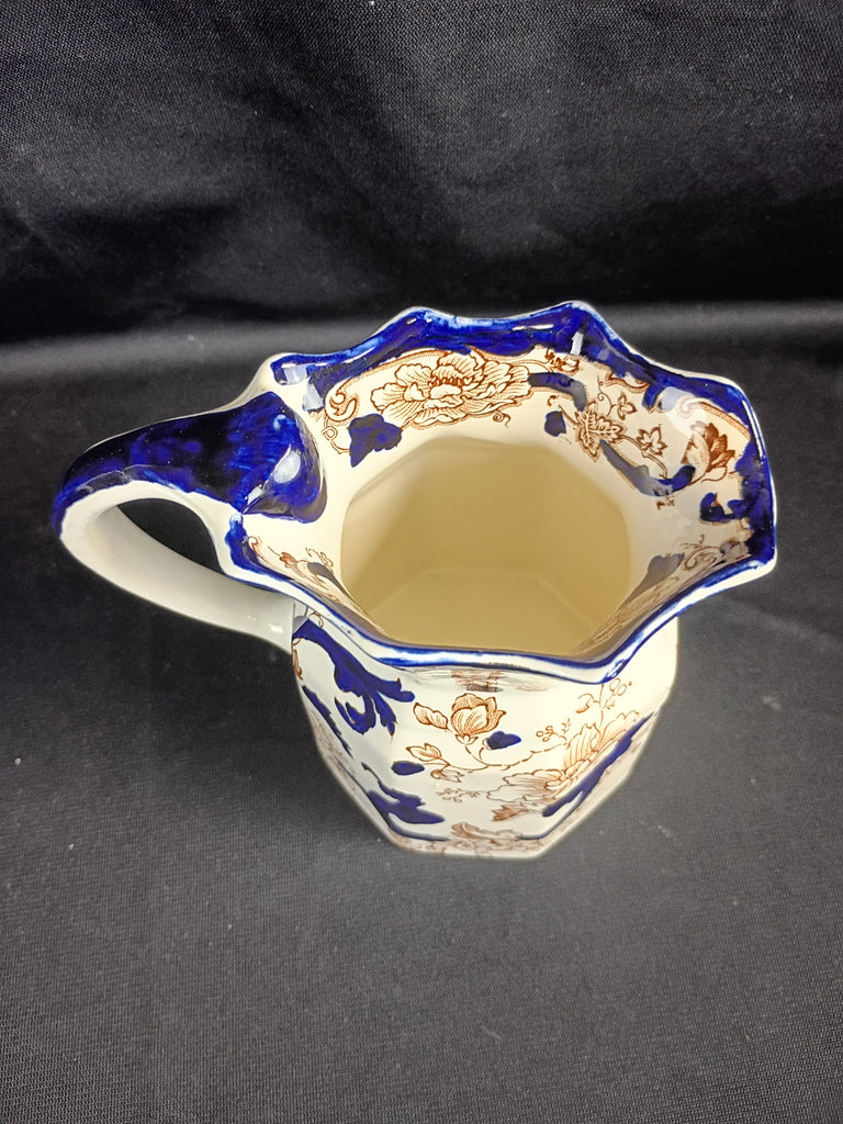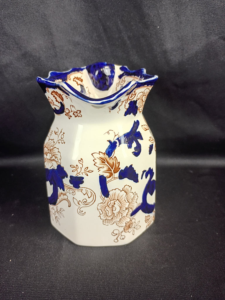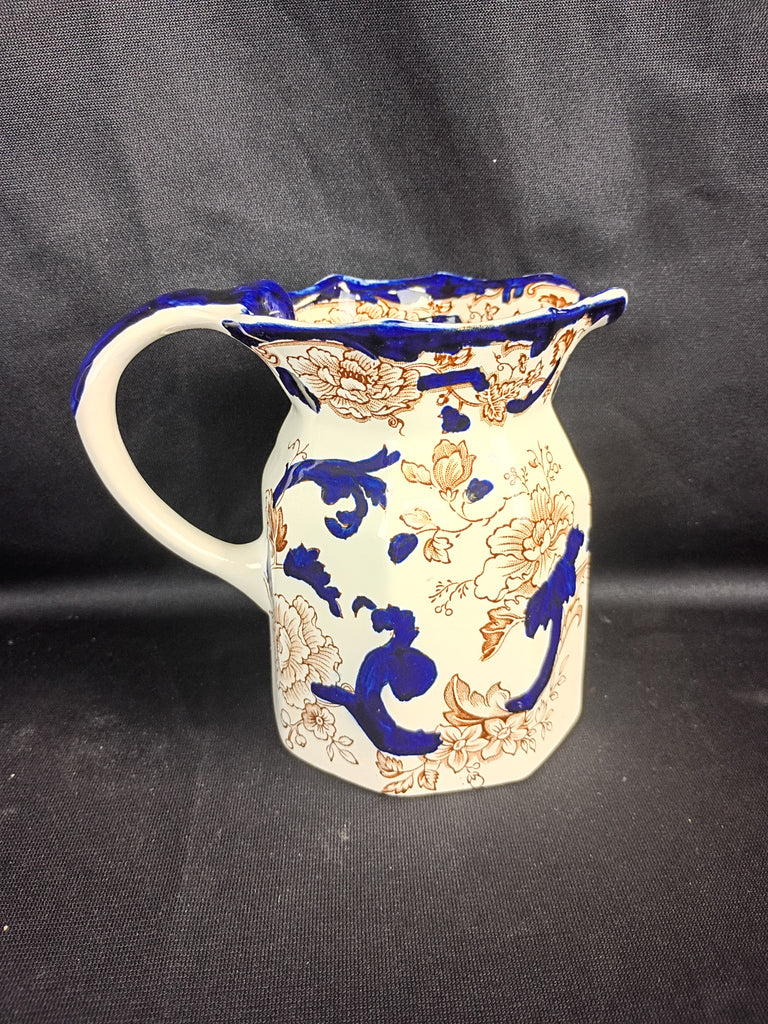 Vintage Masons Mandalay Ironstone Jug. White background with Beige and Black floral design. Measures 4.5"H x 5"W. In very good condition.