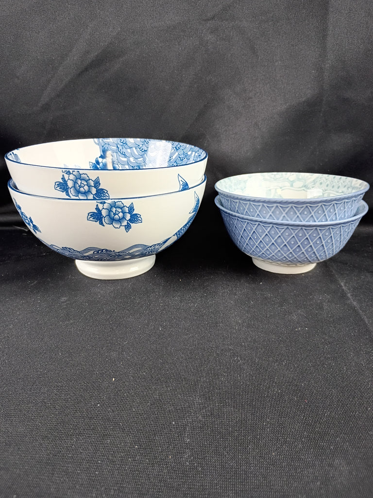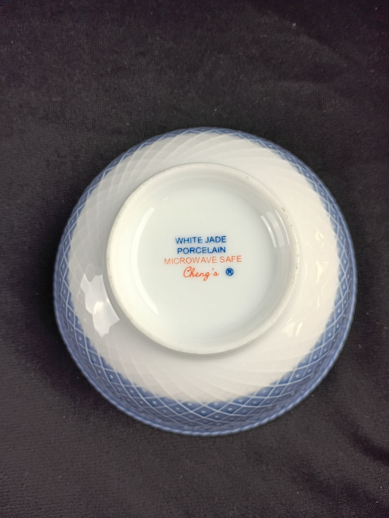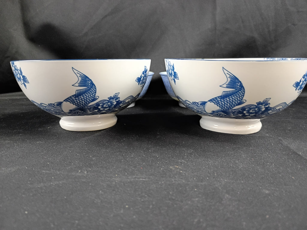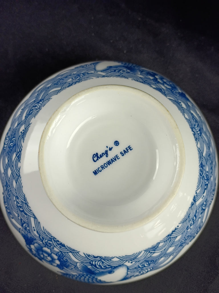 Set of 4 microwave safe porcelain bowls from Cheng's. The smaller bowls feature a village scene, and the larger bowls have a koi motif. Large bowls measure 3"H x 6"W and small bowls are 2"H x 5"W. All in excellent condition.