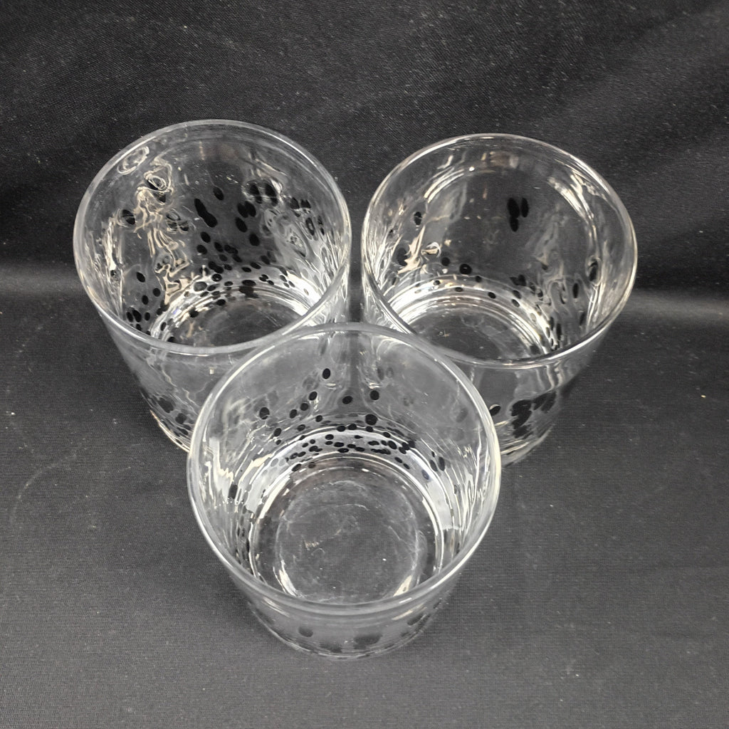Set of three polka dot Old Fashioned Glasses; pre-owned. Measuring 3.5"W x 4" H. In good condition.