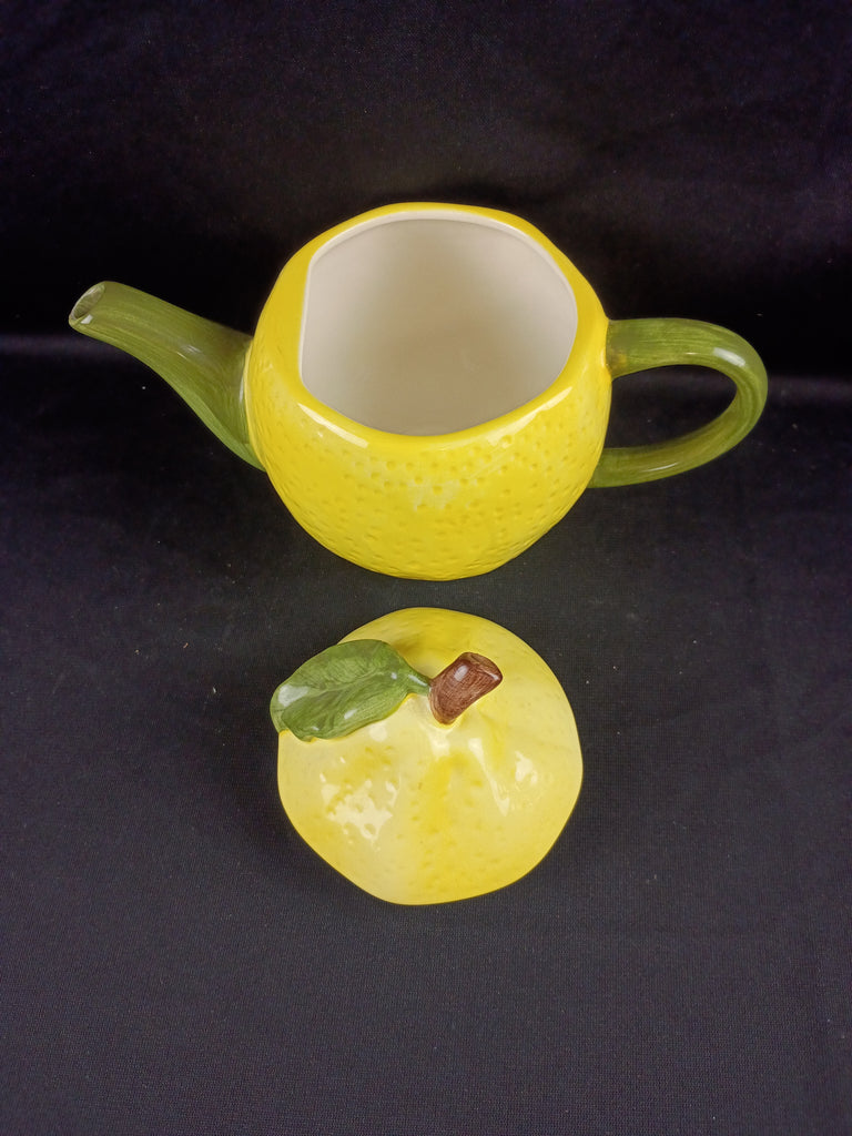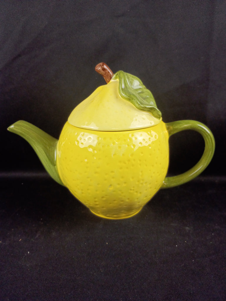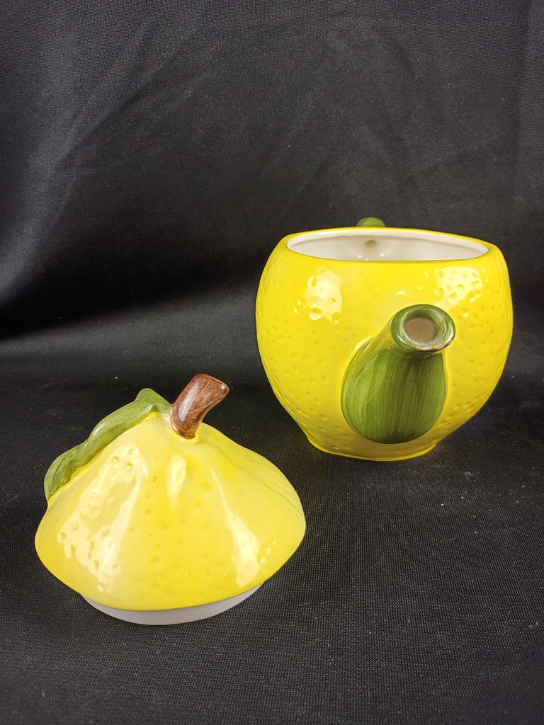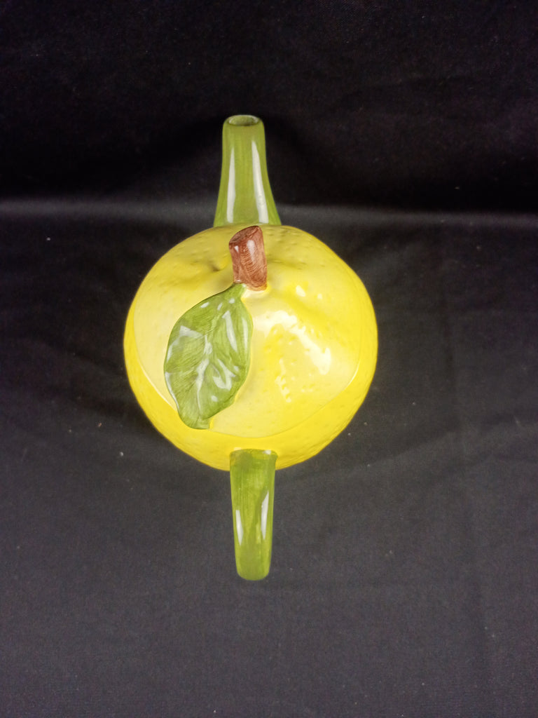 Figural lemon teapot by Teleflora. In excellent condition. Measures appx 7.5"L x 4"W x 6"H. Nifty serving piece to grace your table.