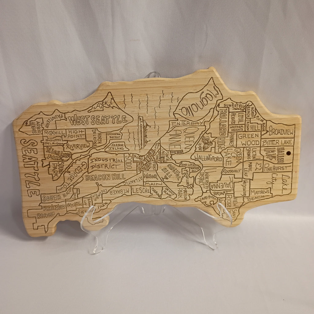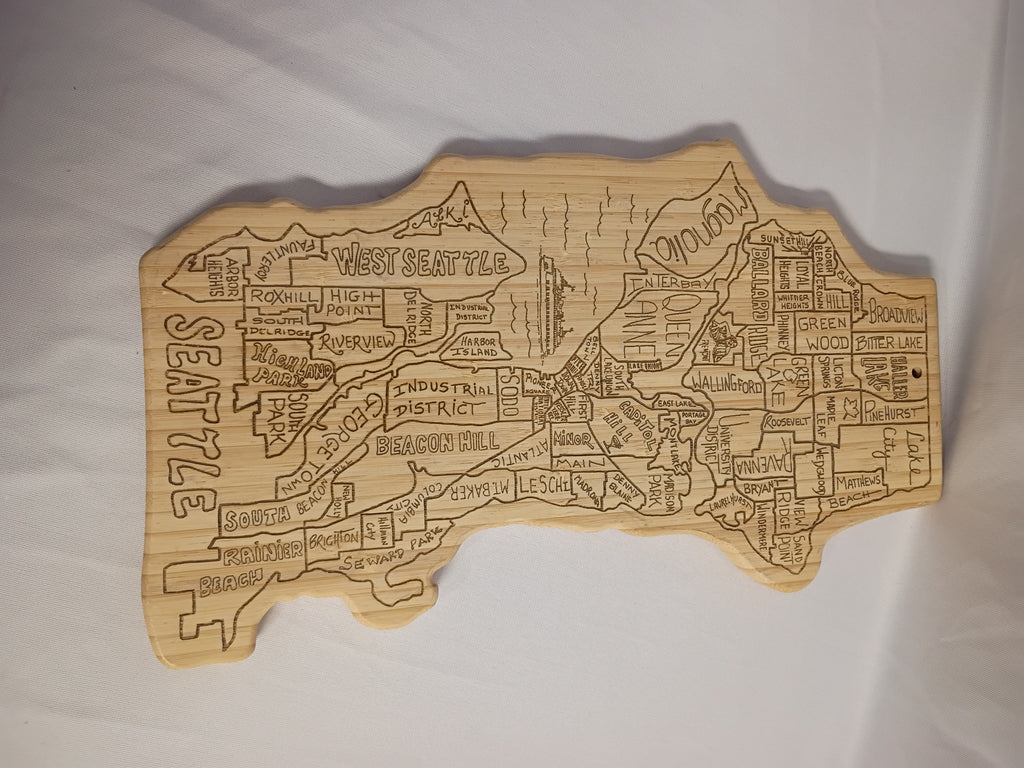 Totally Bamboo brand cutting board. New. In the shape of Seattle with its various neighborhoods highlighted. Measures 15"L x 9"H.