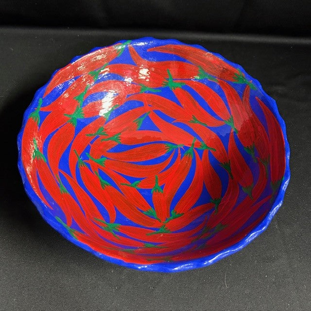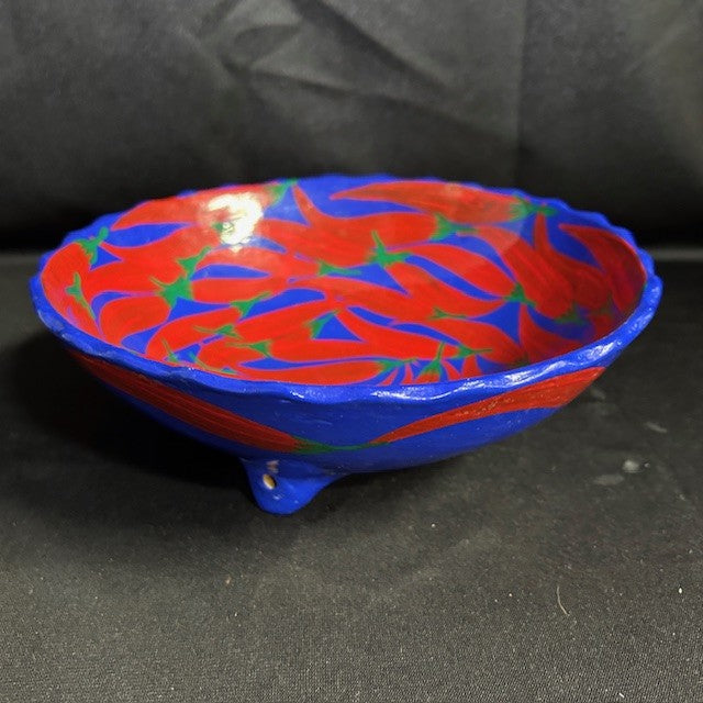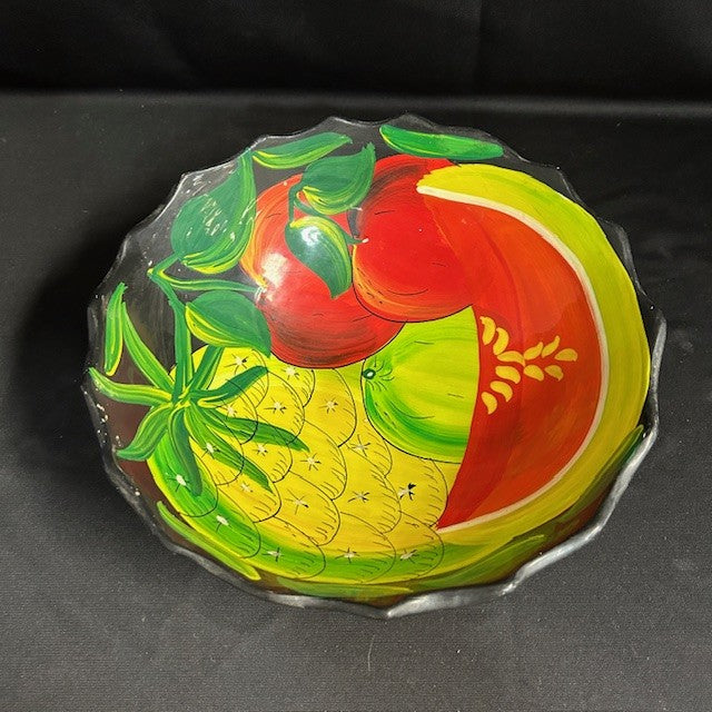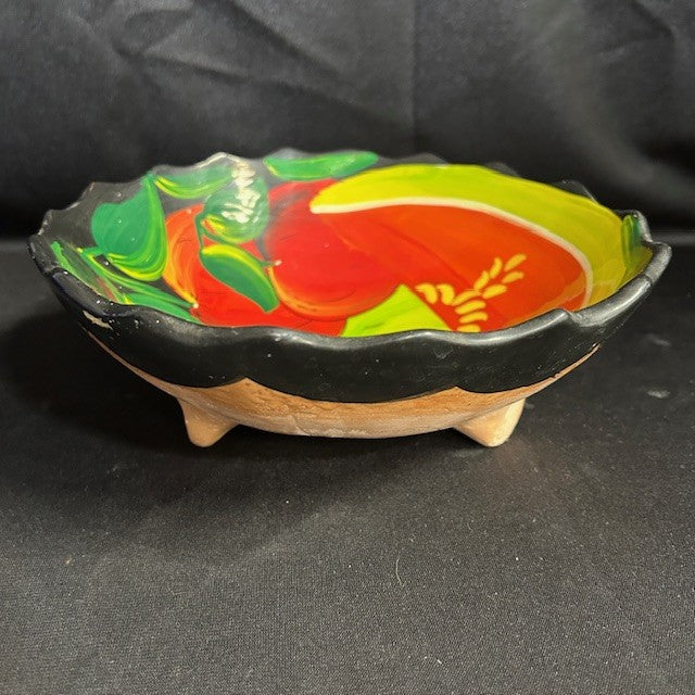 Set of 2 mexican terracotta bowls. Painted and glazed. Each measures 10"W x 3"H. One is blue with red chilis, and the other is a variety of fruit in multicolor. Each bowl is 3 footed. Both in great condition.