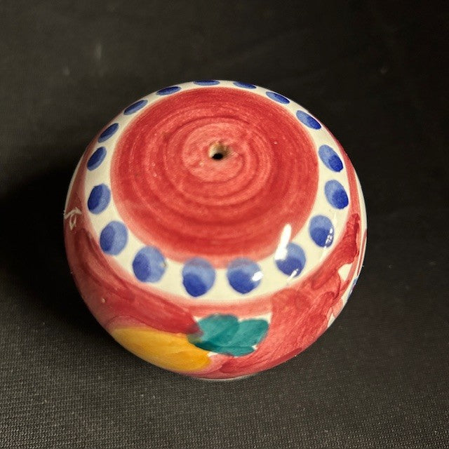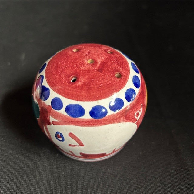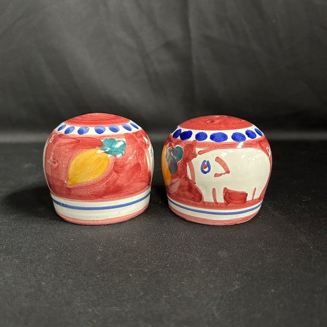 These two Vietri brand salt & peppers were handmade and painted in Italy and feature a Pig and Carrot design accented by red and blue stripes and polka dots. Each measures appx 2.5"H x 2.5"W. Both in excellent condition.