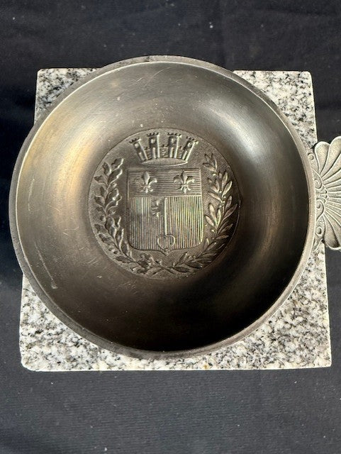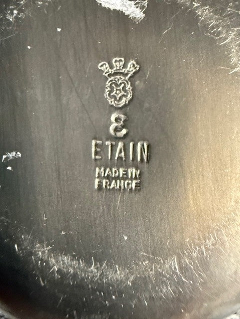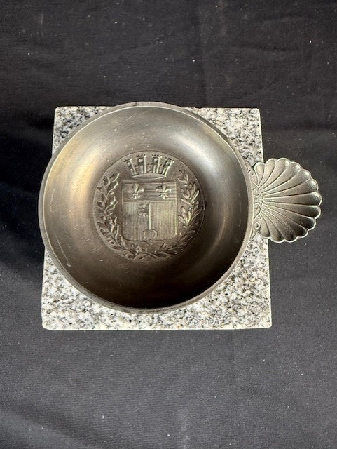 Vintage Etain d'art Titre small wine tasting cup crafted from pewter with heraldic design in the middle. Measures 4”L x 3"W x 0.5"H. Made in France and in very good condition.