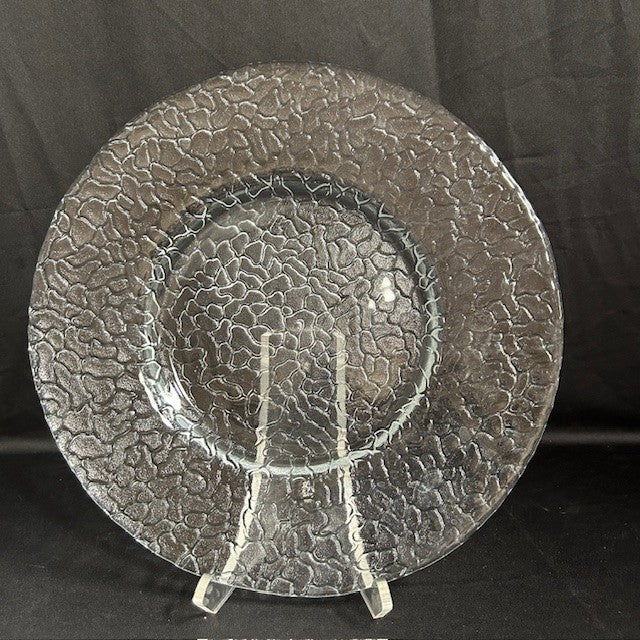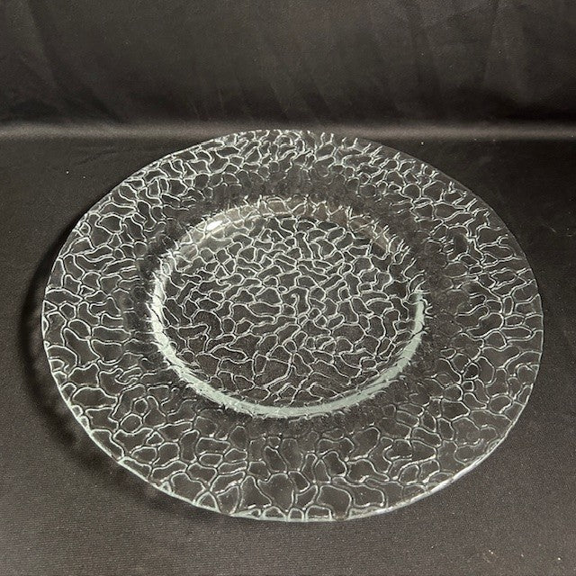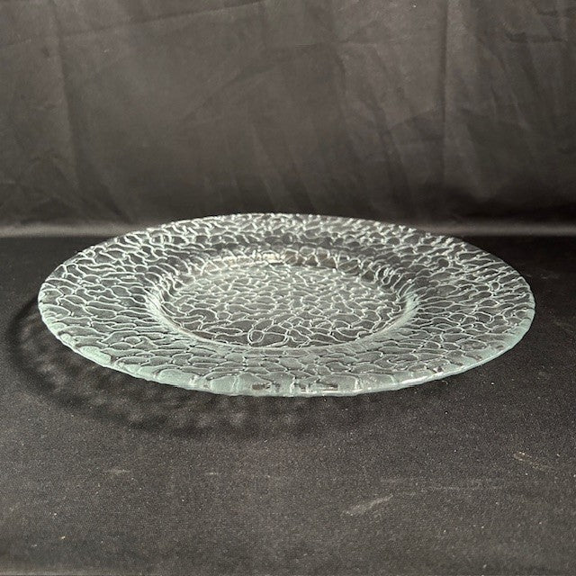 This platter features clear, textured glass with a "cobblestone" pattern often associated with Mid-Century Modern style. Made of thick, break-resistant glass. Excellent condition. Measures 13"D.