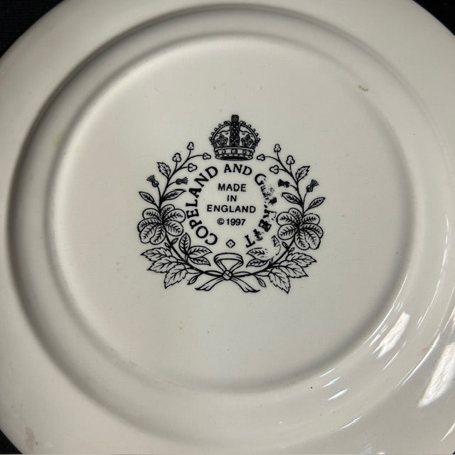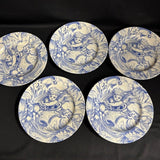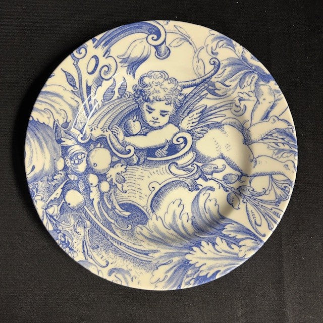 Set of 5 vintage Copeland & Garrett blue cherub plates. Each is hallmarked at the bottom. Features renaissance inspired illustration of cherubs with filigree, flowers, and fruit, in blue on a white background. Each plate measures appx 8"D and are all in great condition.