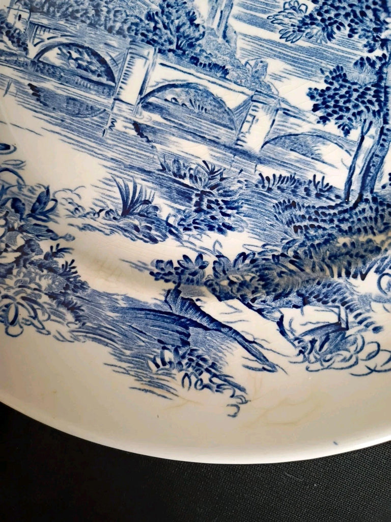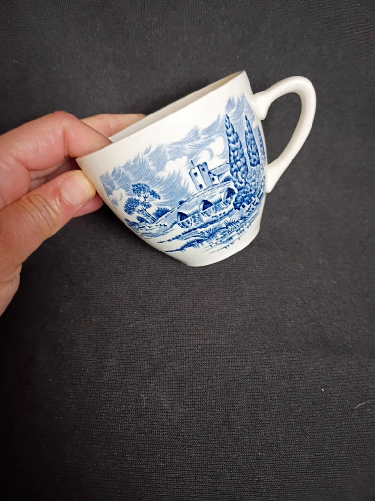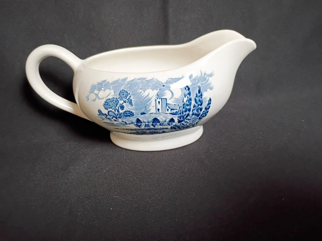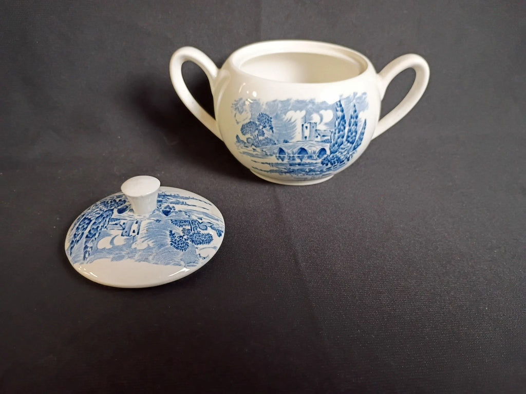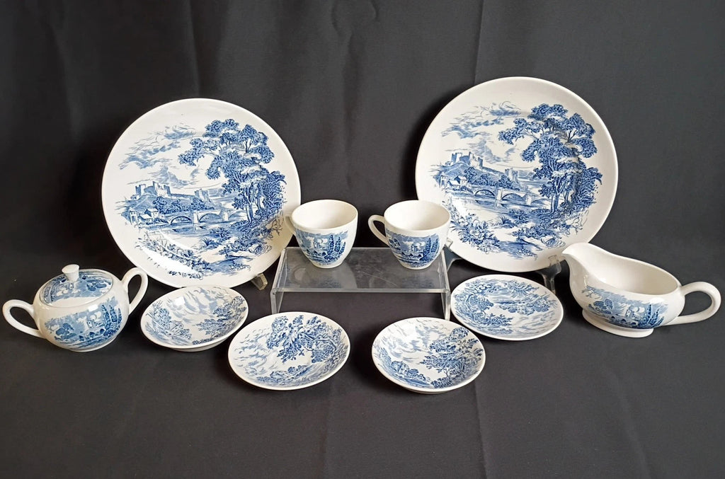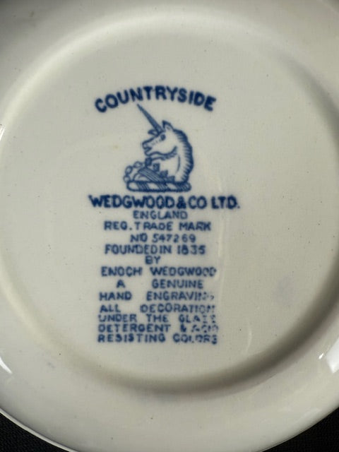 Enoch Wedgwood country side pattern serving set. 10 pieces. All in great condition save for one of the dinner plates has crazing with some brown staining (see photo 4) some minor crazing on 2 other pieces but no staining. Included in the set: 2 dinner plates (10"), 2 tea cups (4.5"L x 3.25"W x 2.75"H - including handle), 2 saucers (5.5"), 2 small bowls (1"H x 5"W), 1 gravy (7"L x 3.25"W x 3"H - including handle), and 1 sugar (6"L x 3.75"W x 4"H - including handles). Great mid century Victorian style collection from Wedgwood. All pieces hallmarked at the bottom.
