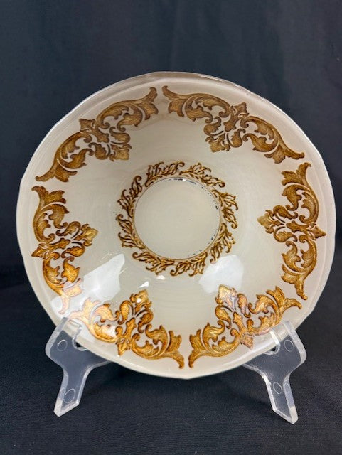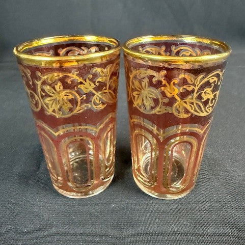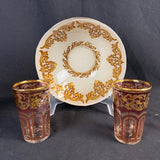 Excellent condition, unusual find of 2 vtg. companies that match! The glasses are Briard & bowl is Godinger. The bowl is Baroque bone china with 18K gold inlay pattern. The Briard glasses look similiar that it's a great set together & would enhance other chinaware! Measurements are bowl 6.75" w. by 2.25" H./ glasses are 3.50" H. by 2.25" W.