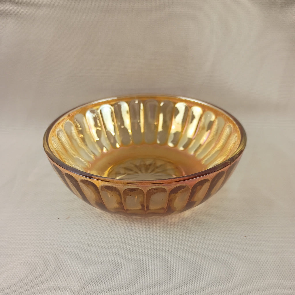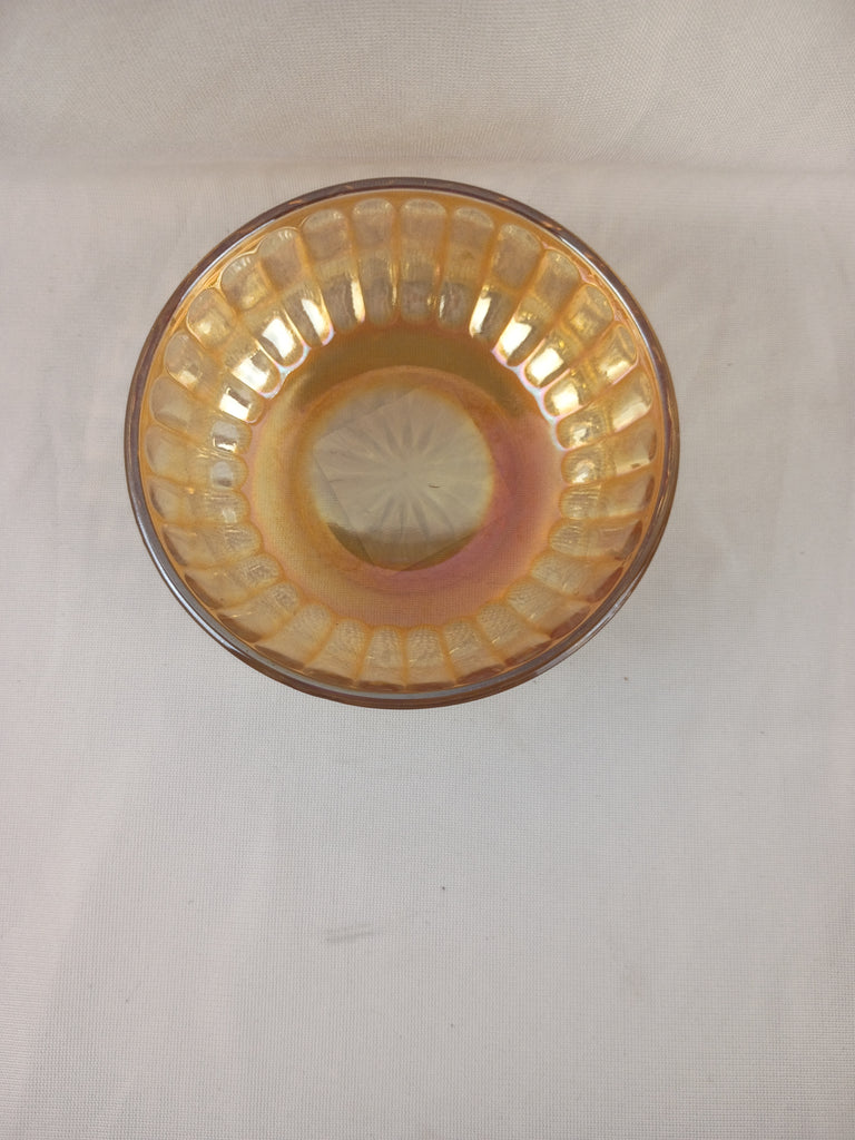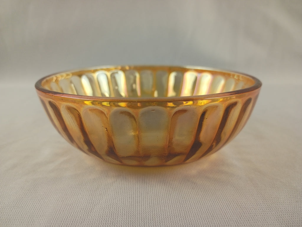 Vintage Marigold colored Carnival Glass Bowl. Measures 4.5"L x 1.5"H. Lovely ribbed pattern. In great condition.