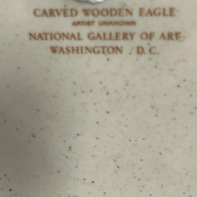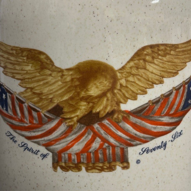 Vintage McCoy Pottery stoneware jug titled "Spirit of Seventy-Six" features an illustration of a Carved Wooden Eagle with the American Flag that is on display at the National Gallery in DC. In great condition - just needs a plug replacement. Measures appx 11"H x 5.75"W.