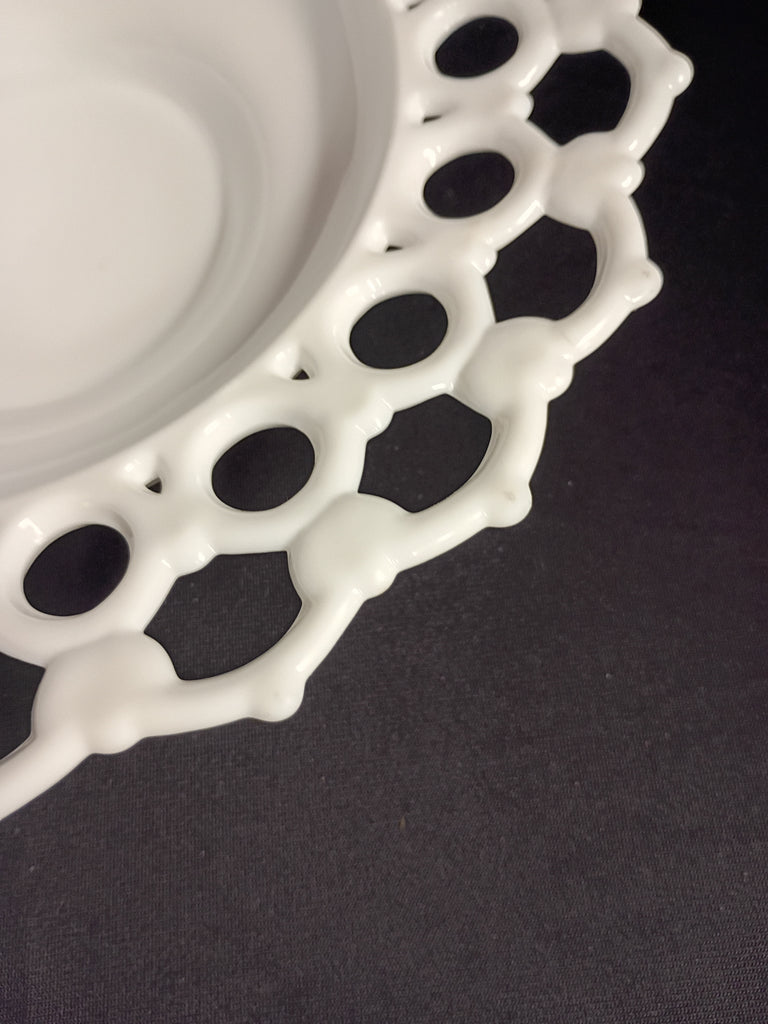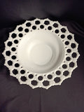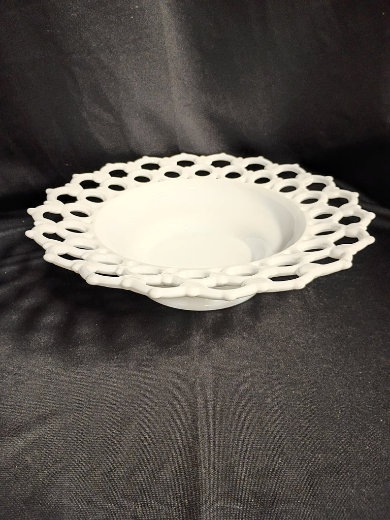 This bowl features an open lace, reticulated rim design often referred to a "Open Lattice Lace Edge". In excellent condition. Can be used as a serving piece, a fruit bowl or a decorative centerpiece. Measures 3"H x 12"W.