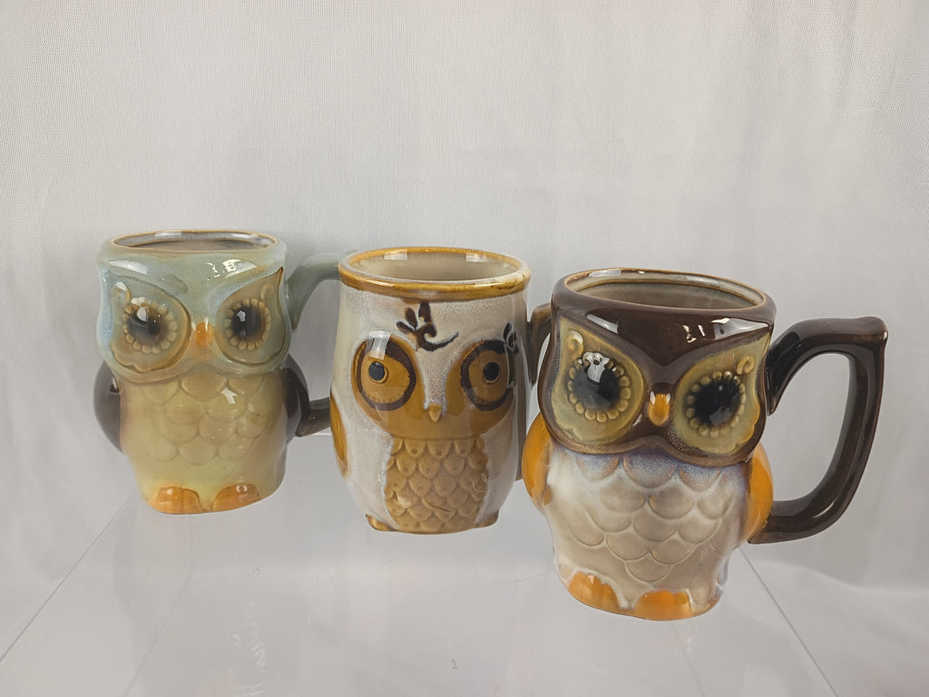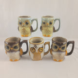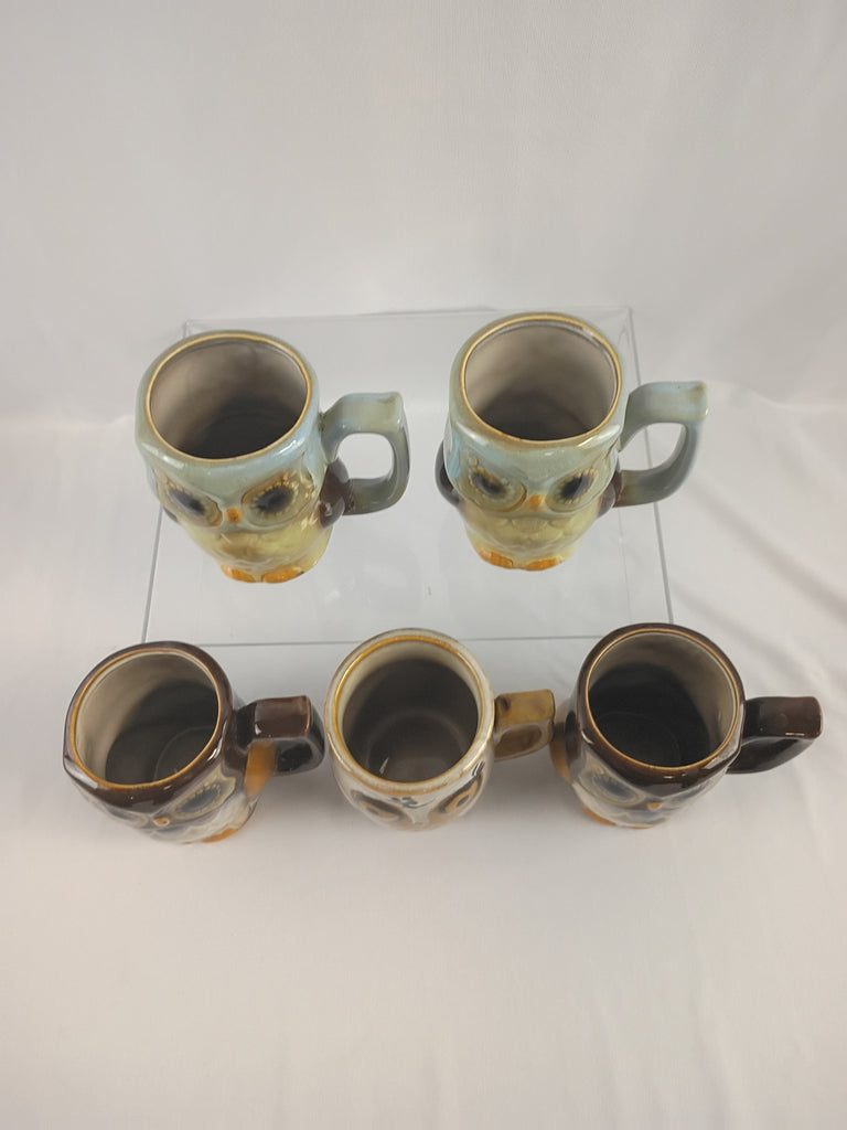 Set of 5 owl mugs all in excellent condition. Ceramic with glossy finish, each measures 4.5"L x 2.75"W x 4"H. Three distinct designs featured.
