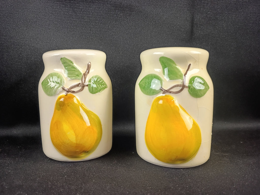Pear-themed ceramic salt and pepper shakers. Stoppers included. Each measures 3"h x 2" dia. Both have a bit of crazing but are in overall good condition.