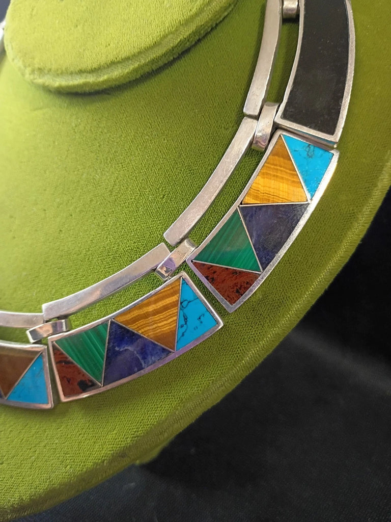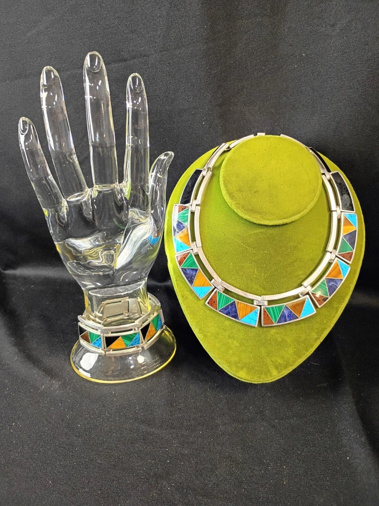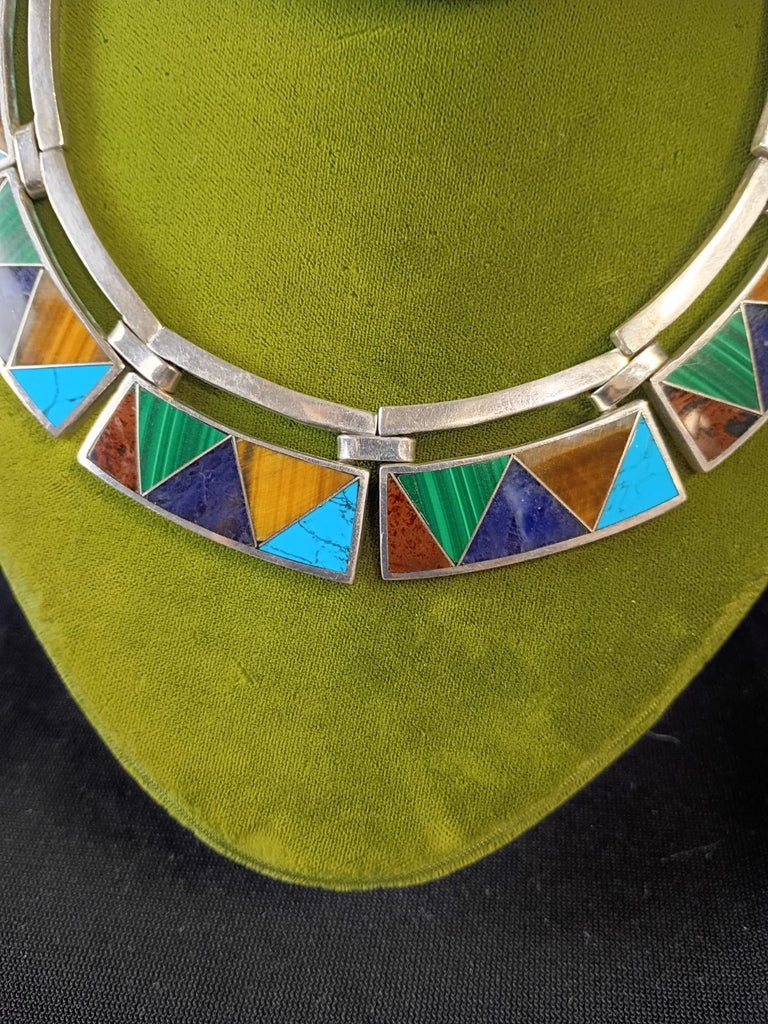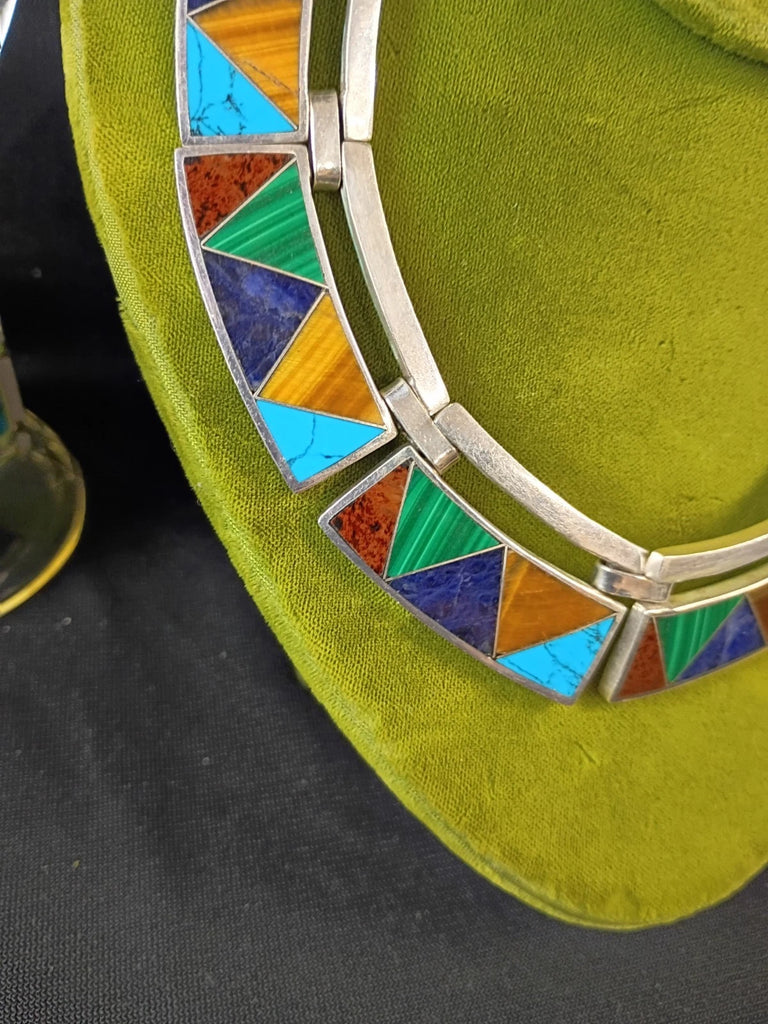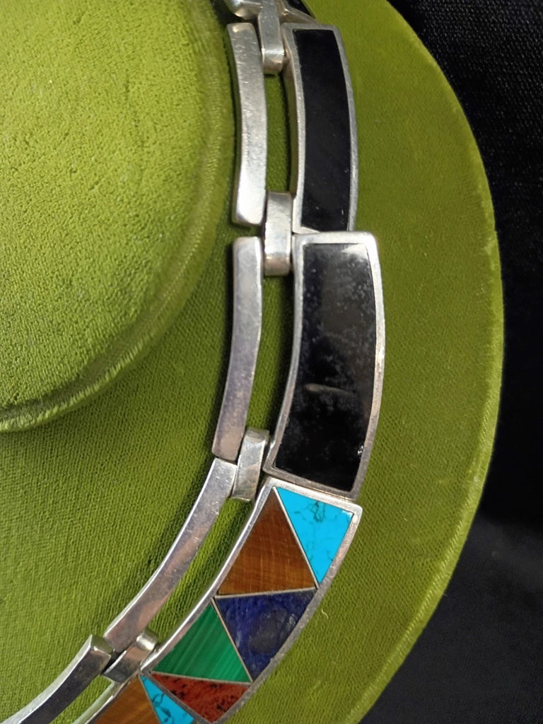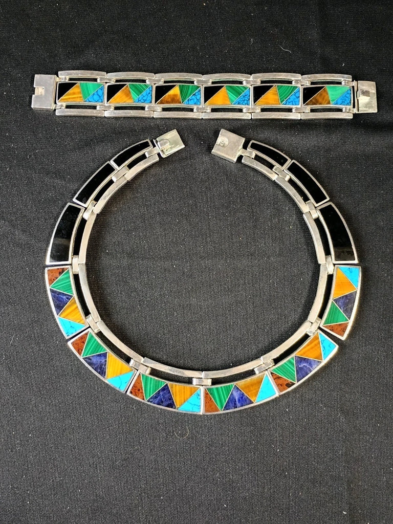 Taxco Collar necklace and link bracelet by Alicia de la Paz. 950 silver purity. Link bracelet is inlaid with turquoise, tiger's eye, malachite, and onyx. Weight is 77.6 grams. Signed by the artist. Necklace is inlaid with turquoise, tiger's eye, obsidian, sodalite, malachite, and onyx. Weight is 138 grams. Also signed by the artist. Some minor wear consistent with age to the silver (light nearly unnoticeable scratches), otherwise in excellent condition; stones are perfect in structure and vibrancy besides miniscule chip on one obsidian chunk in necklace (see photo 3). Necklace measures 15.5"L and bracelet measures 7.5"L.