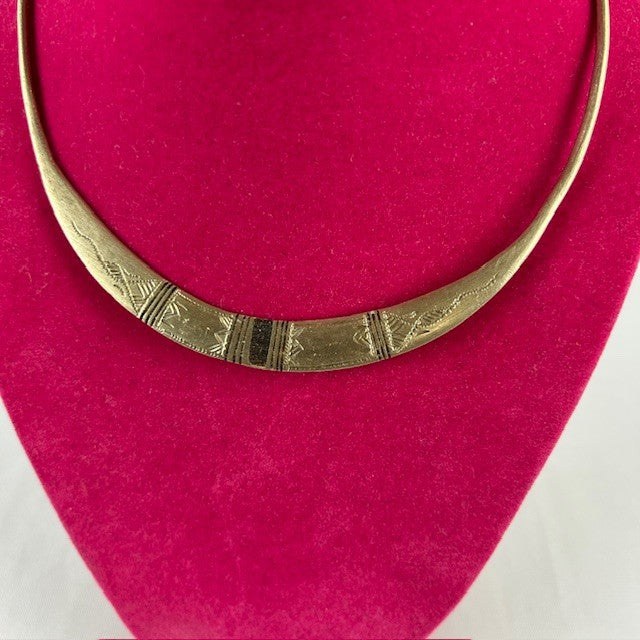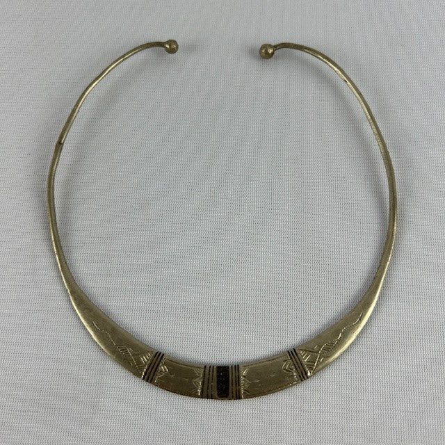 Vintage brass collar necklace made by the Tuareg people of the African Sahara. What looks to be ebony wood inlay in the middle. Tribal etchings. Small bends on the left hand side, in otherwise excellent condition.