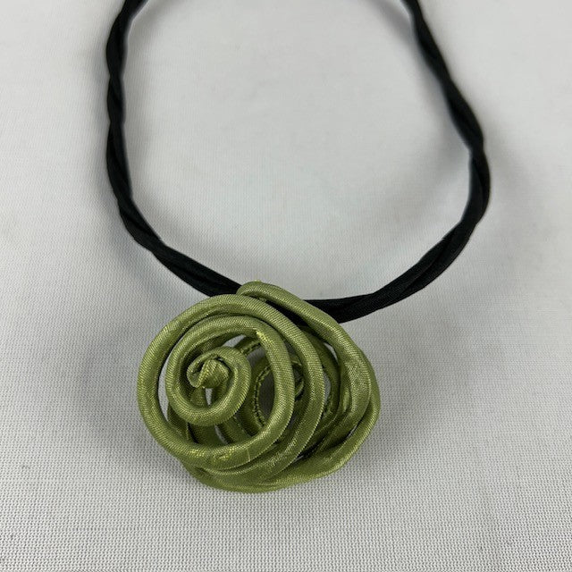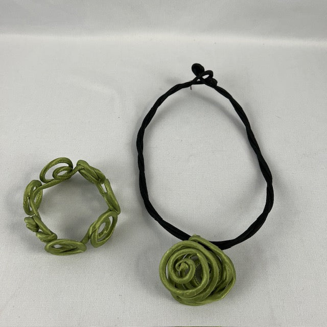 Abstract necklace & bracelet set with chartreuse swirl accents. Wire base covered in satin fabric. Both pieces in great condition and adjustable.