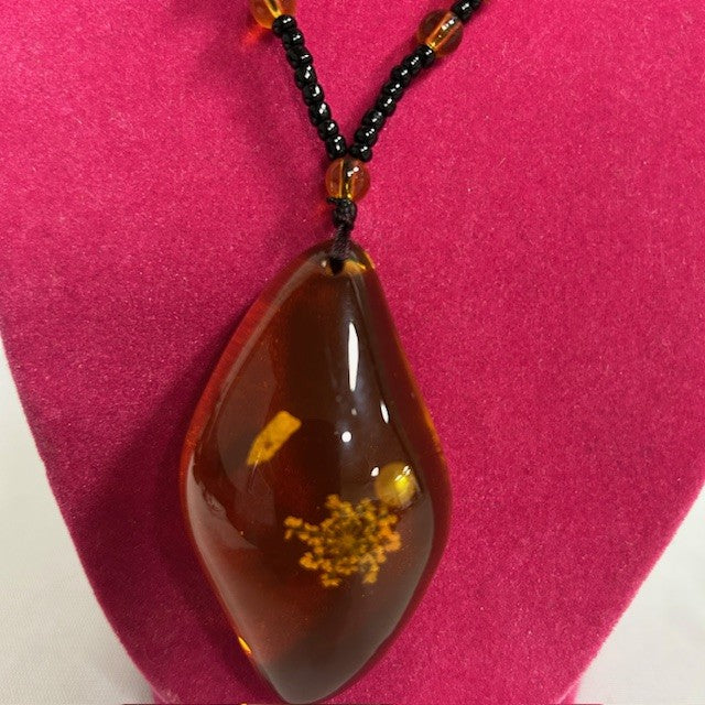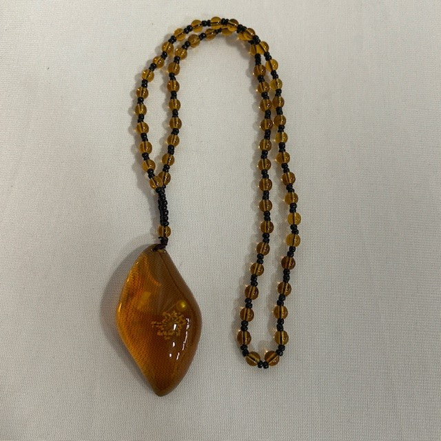 Vintage faux amber pendant necklace. The amber colored diamond shaped pendant has a plant, pearl, and piece of coral trapped inside. Measures 15"L. In excellent condition.