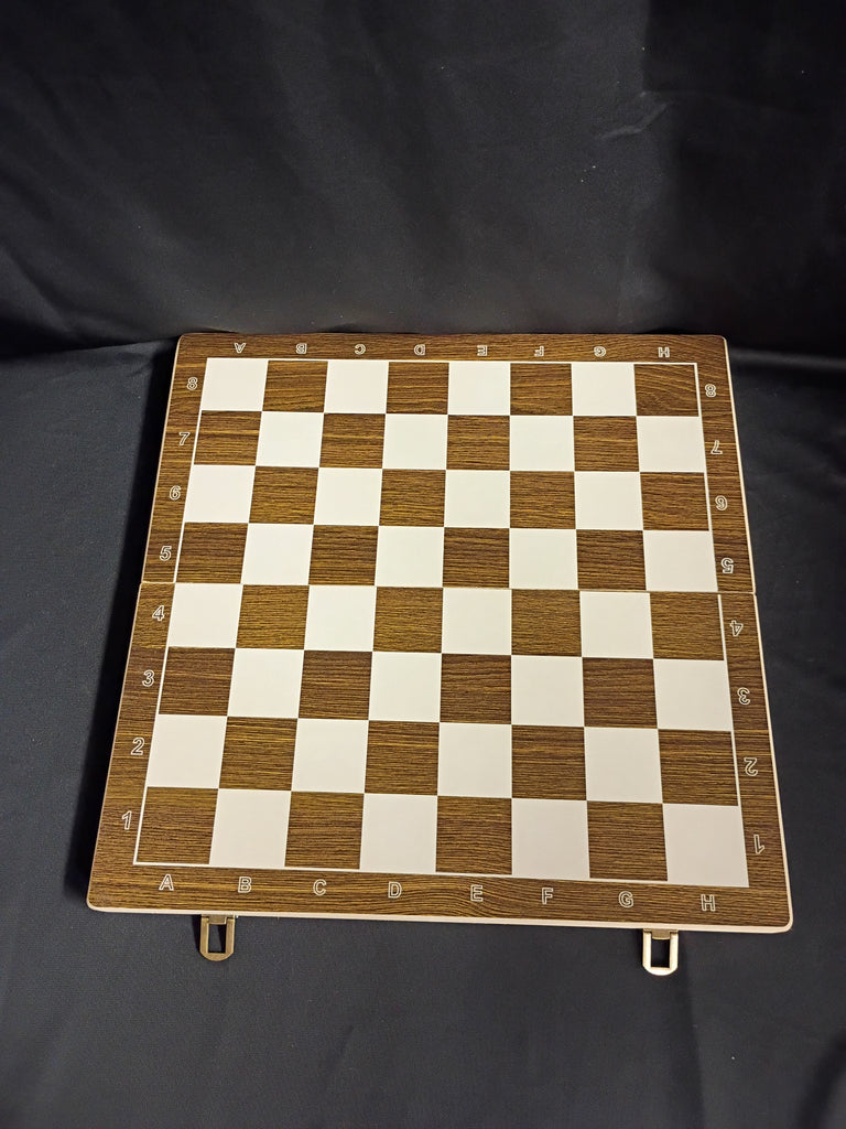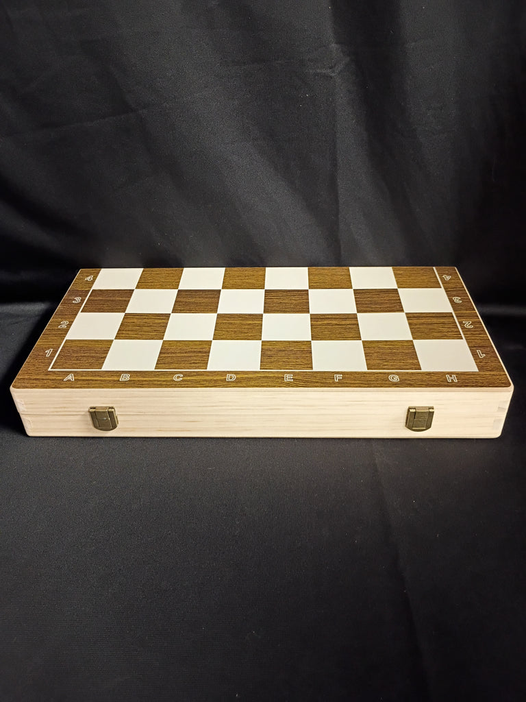 Chess/checker set. Measures 15.75 square unfolded, and 15.75"L x 8"W x 2.5" thick when folded. Comes with all pieces.