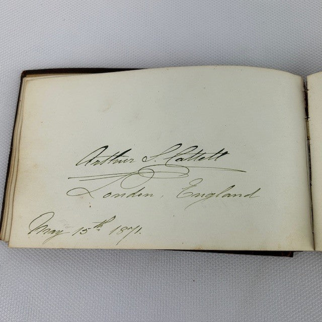 Antique autograph book from the 1800s. Showcases the ornate signature styles of dignitaries from the age. Leather binding shows wear. Many of the autographs are faded but some are still crisp and vibrant. Great collectible.