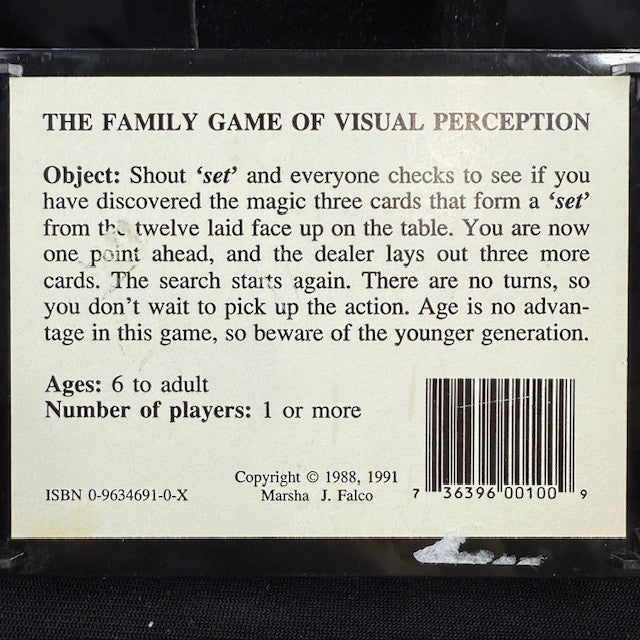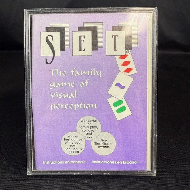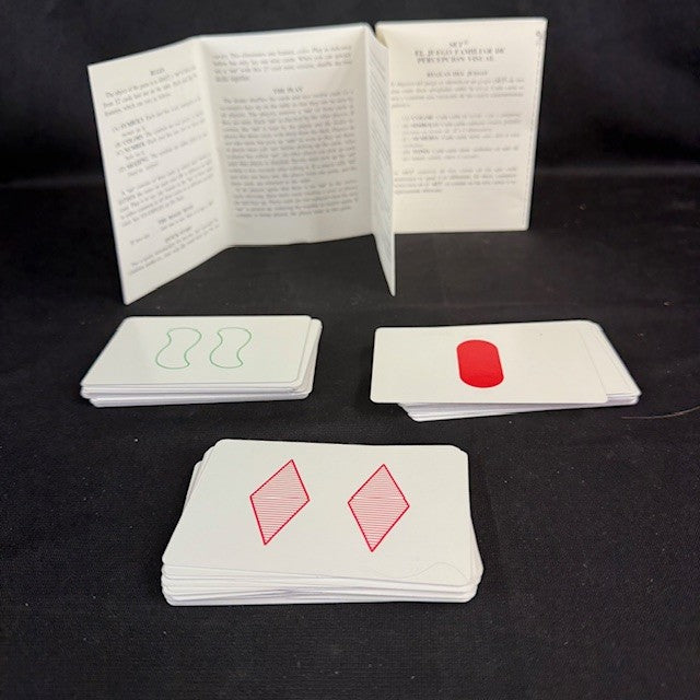 An award-winning game from 1991 where players race to find "sets" of three cards, each featuring shapes, numbers, colors, and shading that are either all the same or all different.