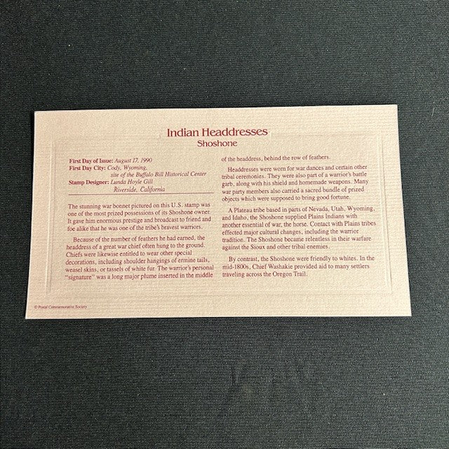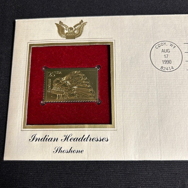 Exquisite 22K gold plated first day of issuance stamp produced by the United States Postal Service. The title of the series was "Indian Headdresses" and this collectable 25 cents stamp features an illustration of the Shoshone Tribal Headdress. In excellent condition with original paperwork. 4.5" H X 7.5" W.