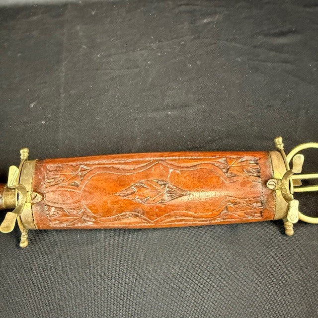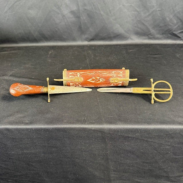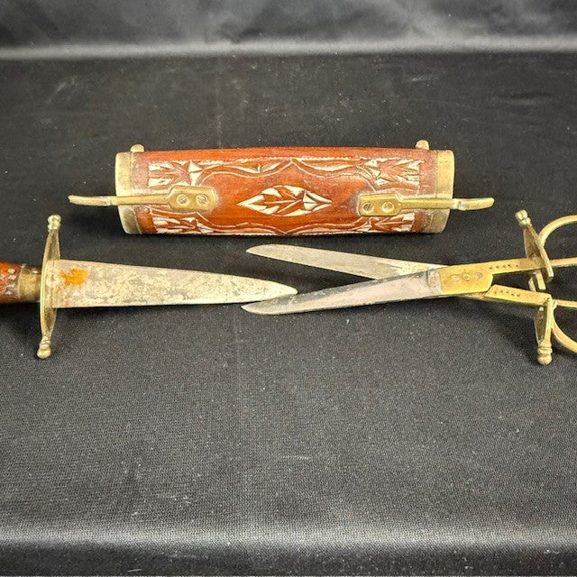 Antique handmade wooden letter opener with scissors. All fits together in engraved leather case. In great condition.