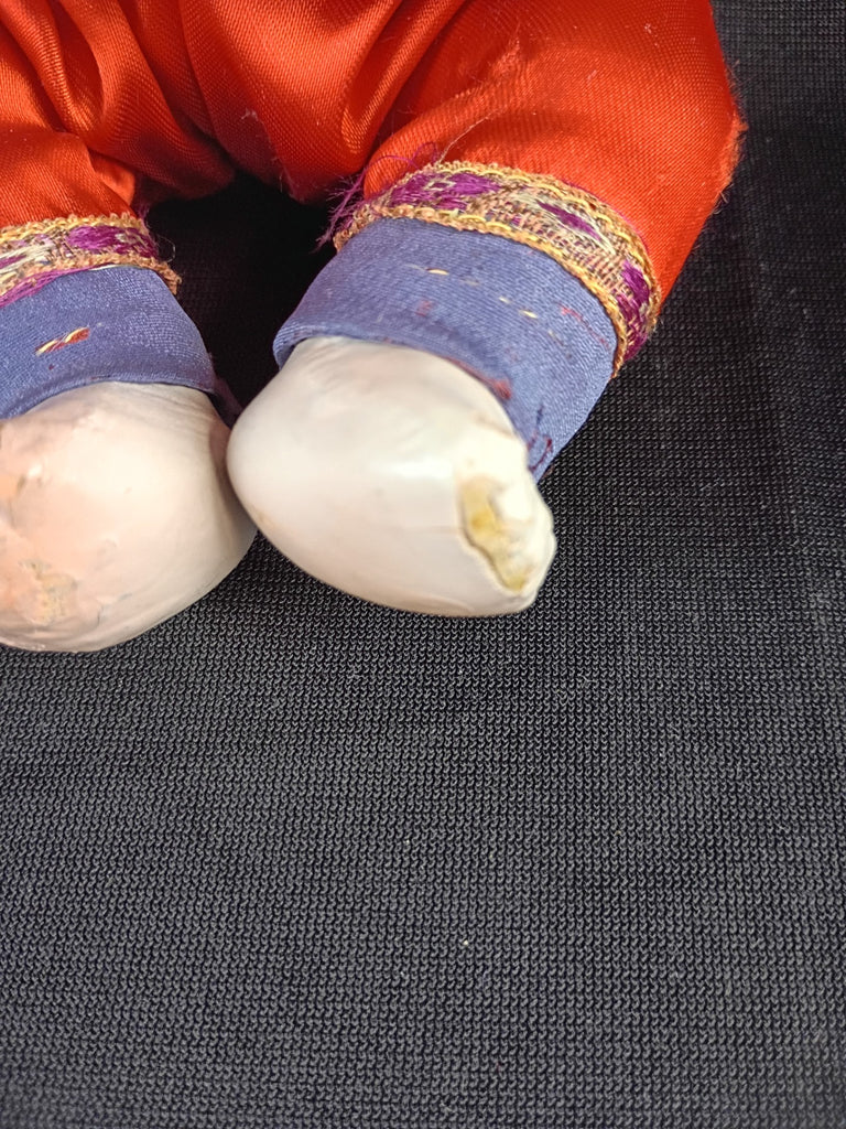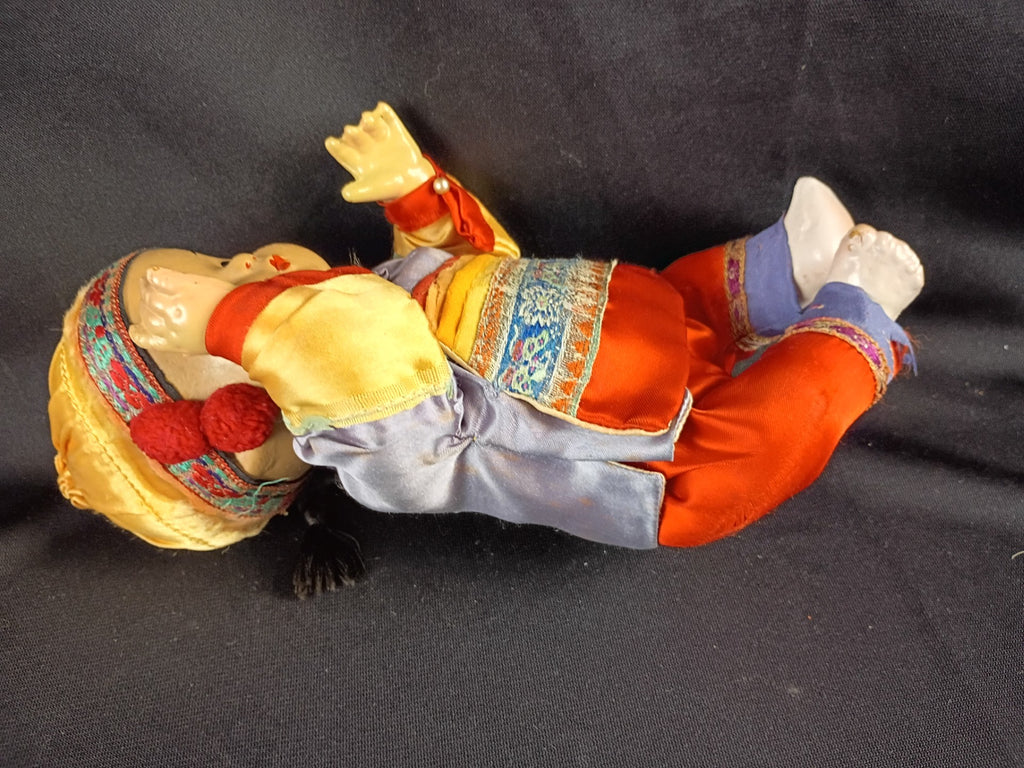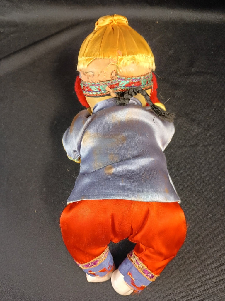 Vintage jointed East Asian composition doll has original silk clothing, hard body and a long braid. Some of the silk is pulling apart and a few chips on foot and hand. Head, arms and legs move. Measures 9"H x 4"W x 3"D.