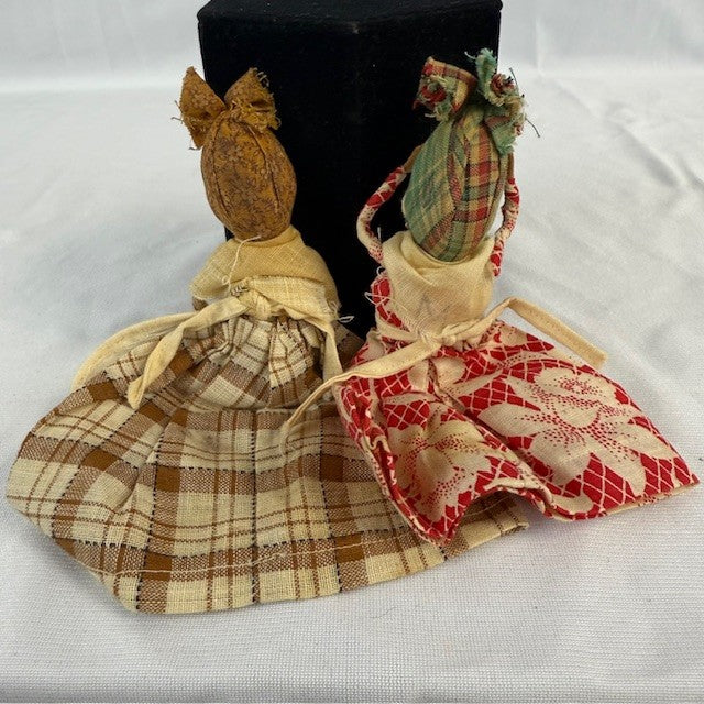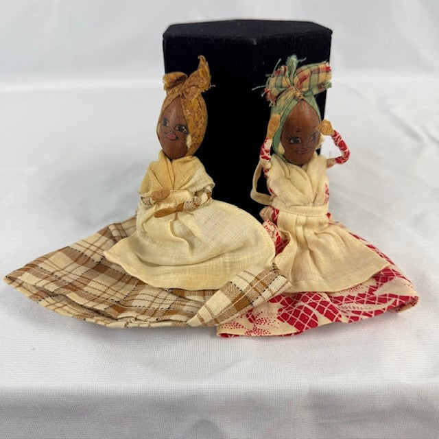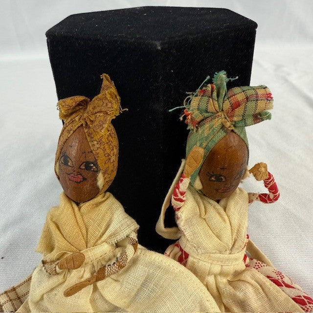 Pair of two vintage African American folk art doll with kerchief, dress, apron and shawl. A bit of discoloration on the aprons but otherwise no staining. Cotton is under kerchief and hands are wood. Each stands 7" tall and has a lovely face complete with red lips. A great find for any collection.
