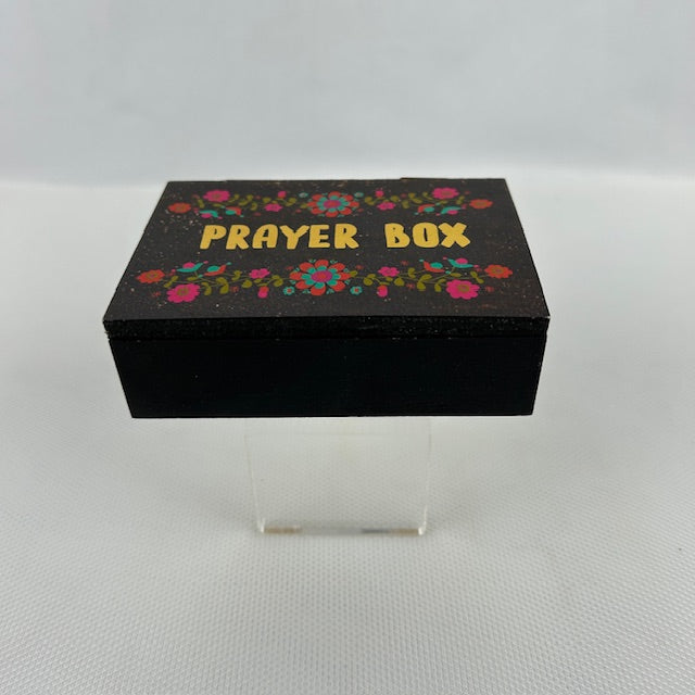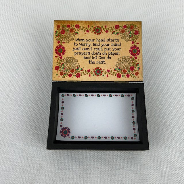 Small hinged-lid prayer box. Intended to write your worries down and give them to God. Measures appx 4"L x 3"W x 1.5"H. Comes with paper inside.