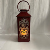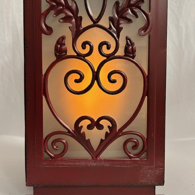 Indoor/Outdoor Flickering Flame Lantern by Valerie. In excellent condition with paperwork. Tested and working perfectly. Scroll heart design. Measures 21"H x 6.5"W.