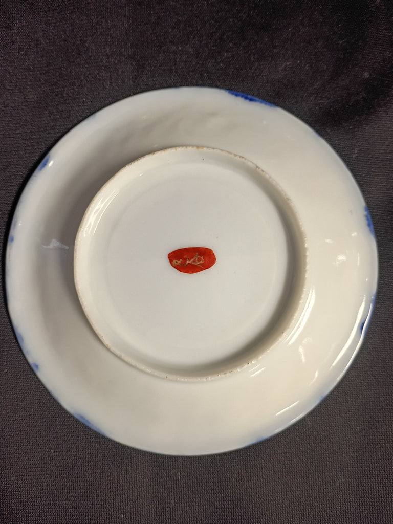 Charming Japanese Kutani porcelain teacup and matching saucer, handpainted porcelain with geisha figures, birds and traditional landscape. A few chips on one of the cup's ridge, very minor. Cups measure 3"H x and saucer is 5".