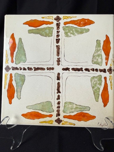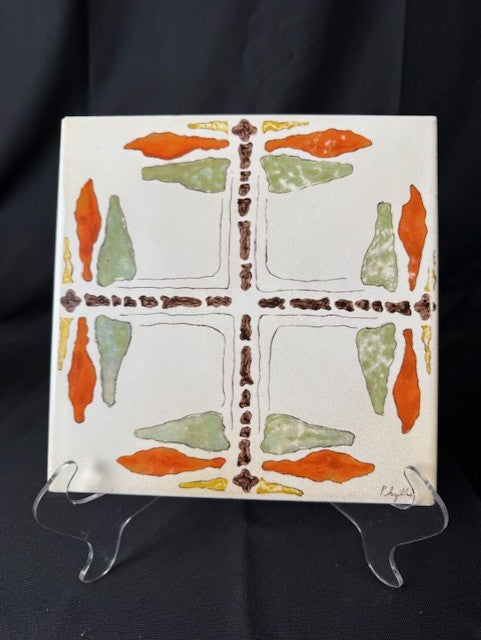 Italian trivet in colors of cream, orange, green and brown with cross design in the middle. In excellent condition. Measures 8" square.