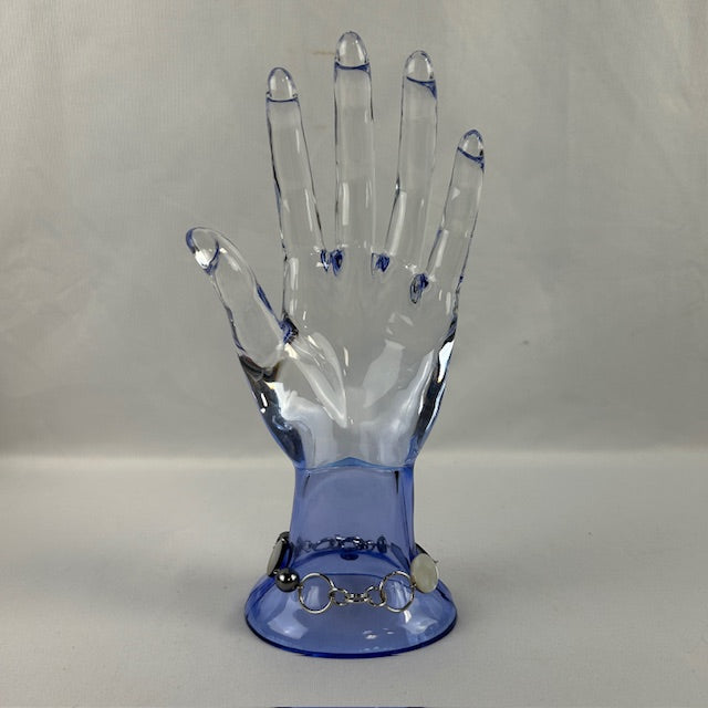 Silver tone bracelet with toggle closure. Features iridescent dark colored beads and natural abalone ovals. In excellent condition. Measures 8"L.