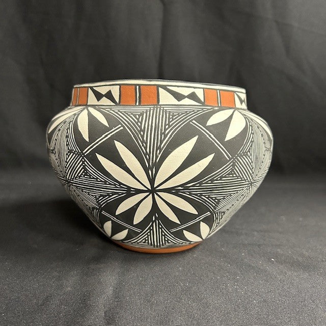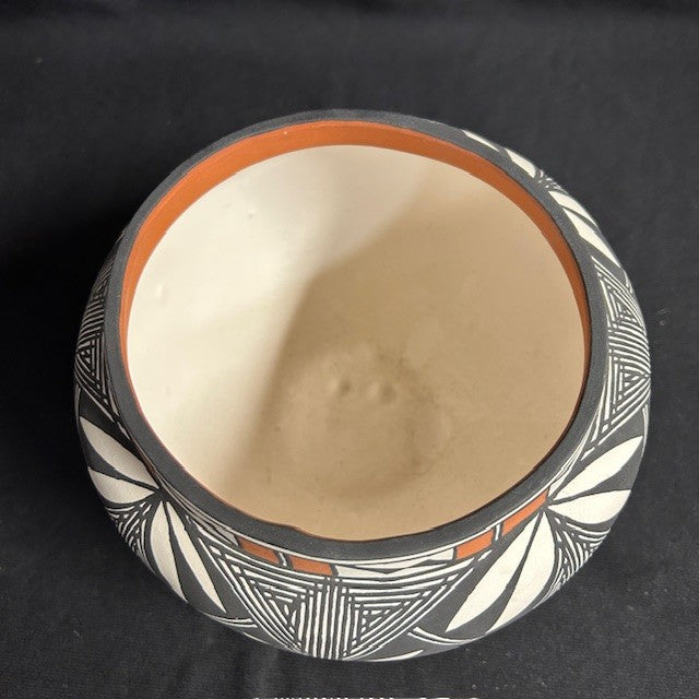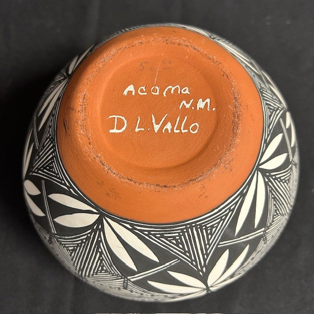 Crafted D.L. Vallo, a member of the Vallo family known for their beautiful traditional Acoma pottery. Measures 7"H x 5.5"W. In excellent condition. White with brown and white tribal geometric patterns. In excellent condition.